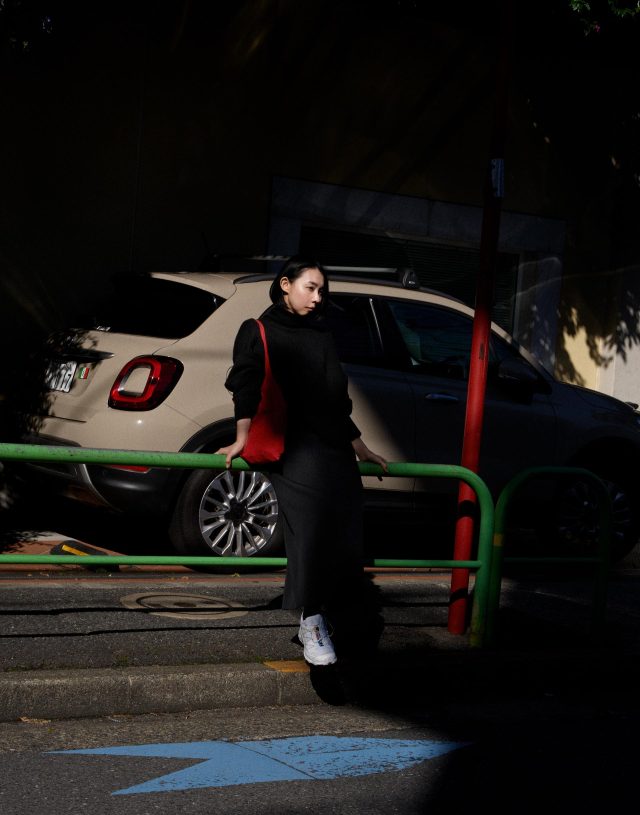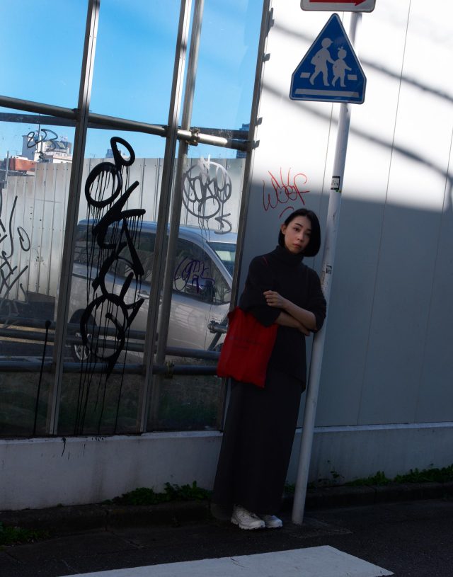 ニット/Mame Kurogouchi (マメ クロゴウチ)、スカート/th products (ティーエイチ プロダクツ)、シューズ/SALOMON (サロモン)、バッグ/Fraenkel Gallery (フレンケルギャラリー) で購入