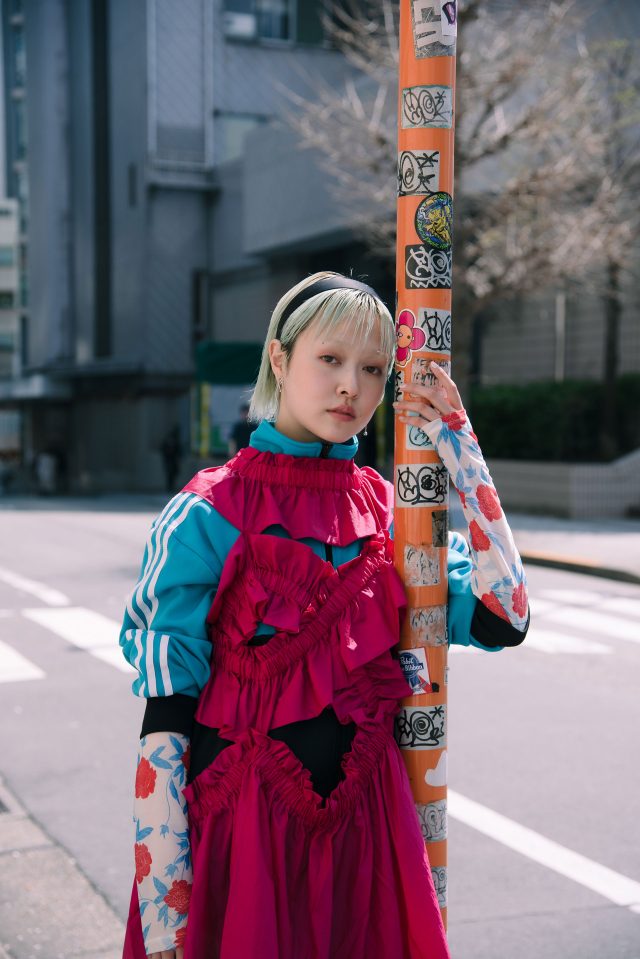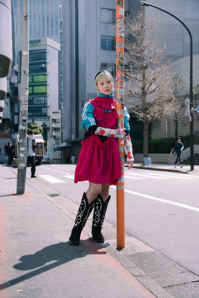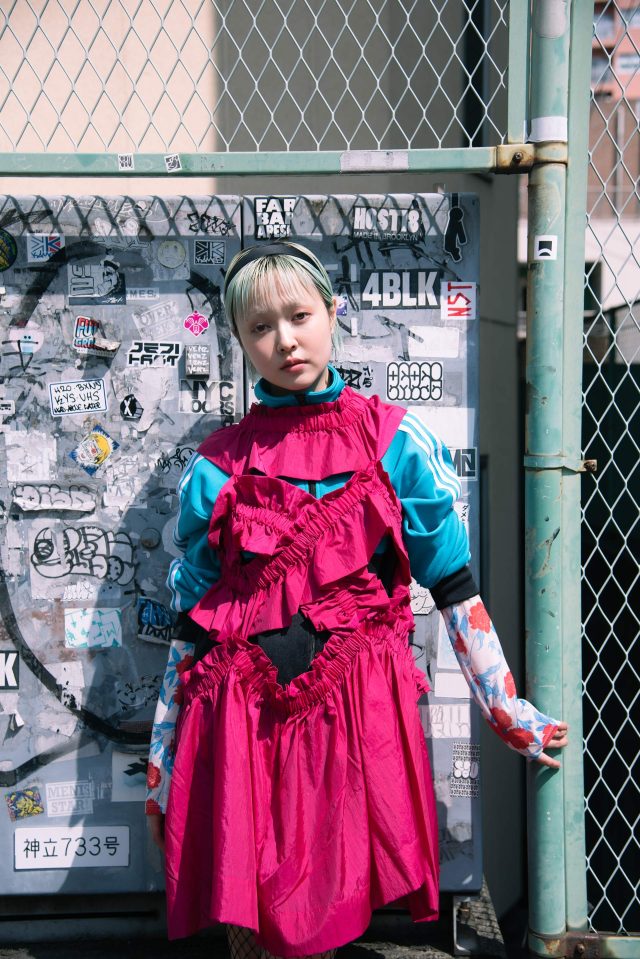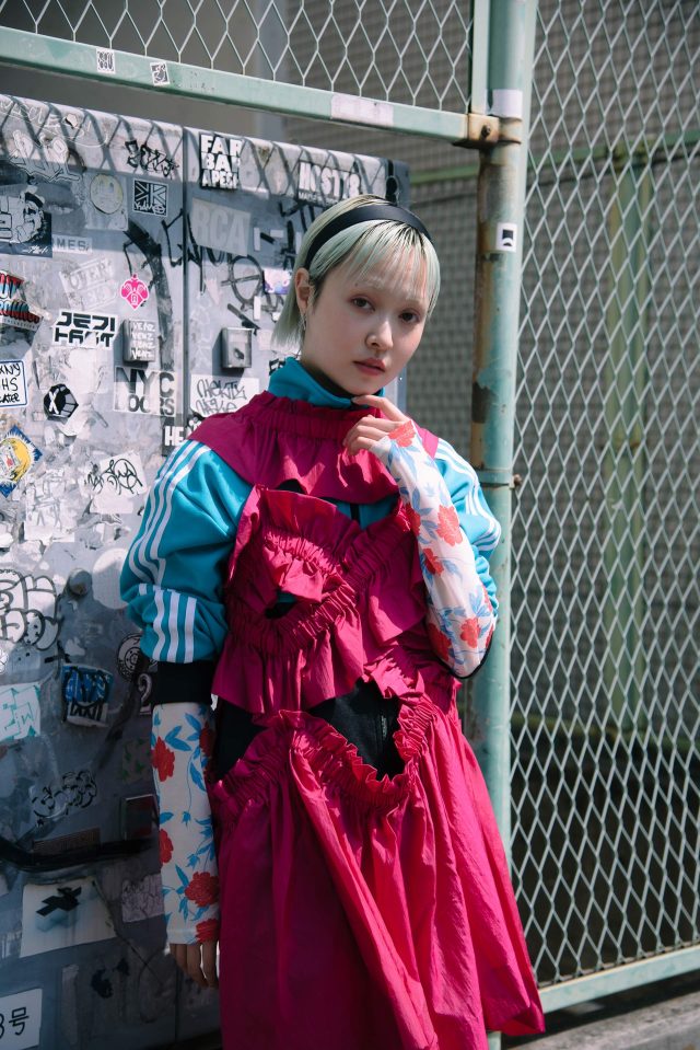 トップス/FUMIE=TANAKA (フミエタナカ)、ジャージ、ブーツ/ ともに古着 (PUNK CAKE で購入)、ドレス/HOUGA (ホウガ)、スカート/ Vintage (ヴィンテージ)