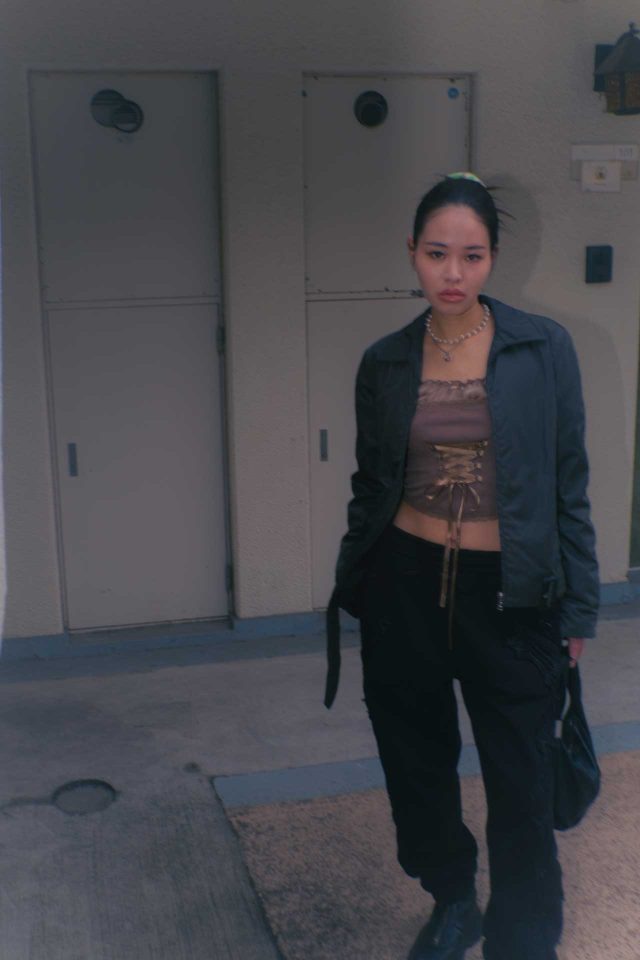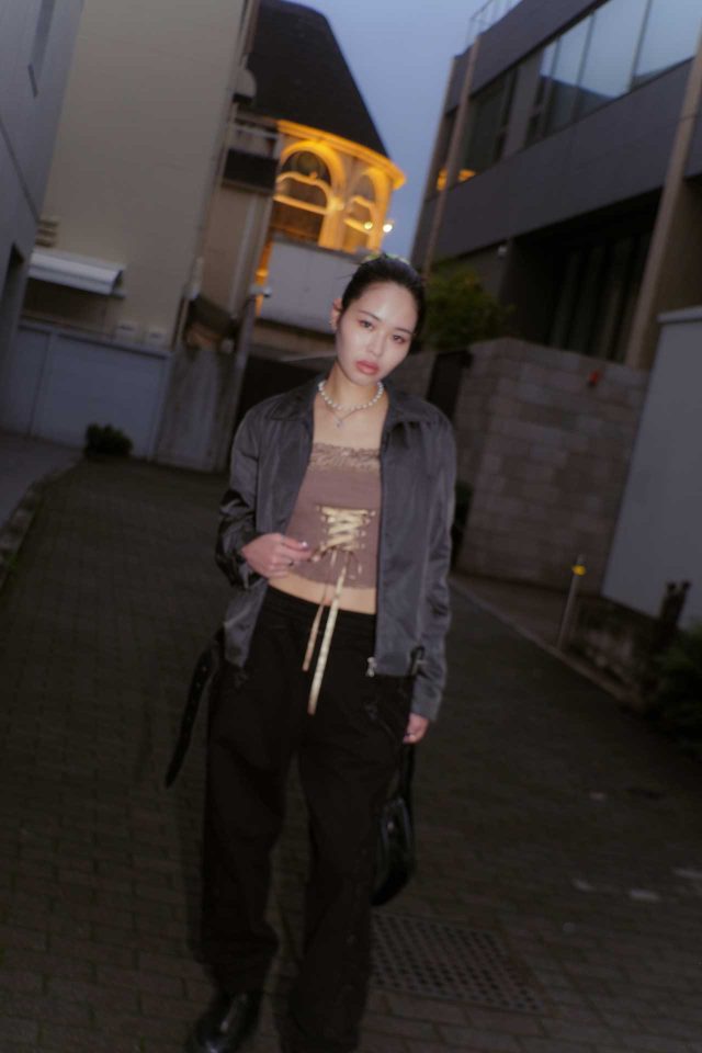 ジャケット/PRADA (プラダ)、トップス/JADED LONDON (ジェイデットロンドン)、パンツ/Supreme (シュプリーム)、シューズ/Eytys (エイティーズ)、バッグ/1017 ALYX 9SM (アリクス)