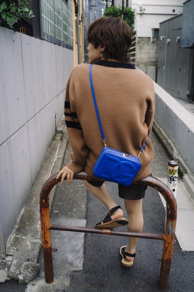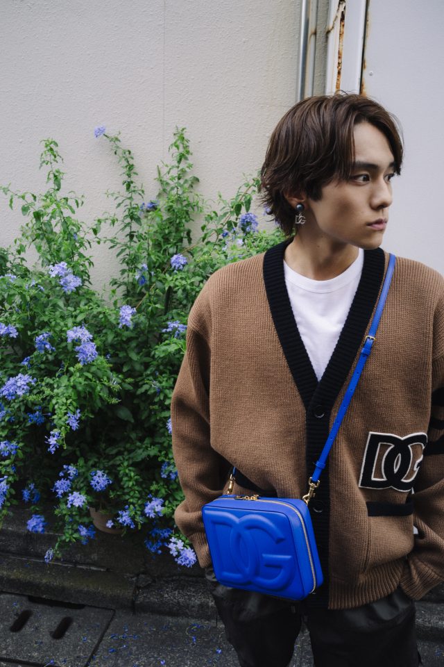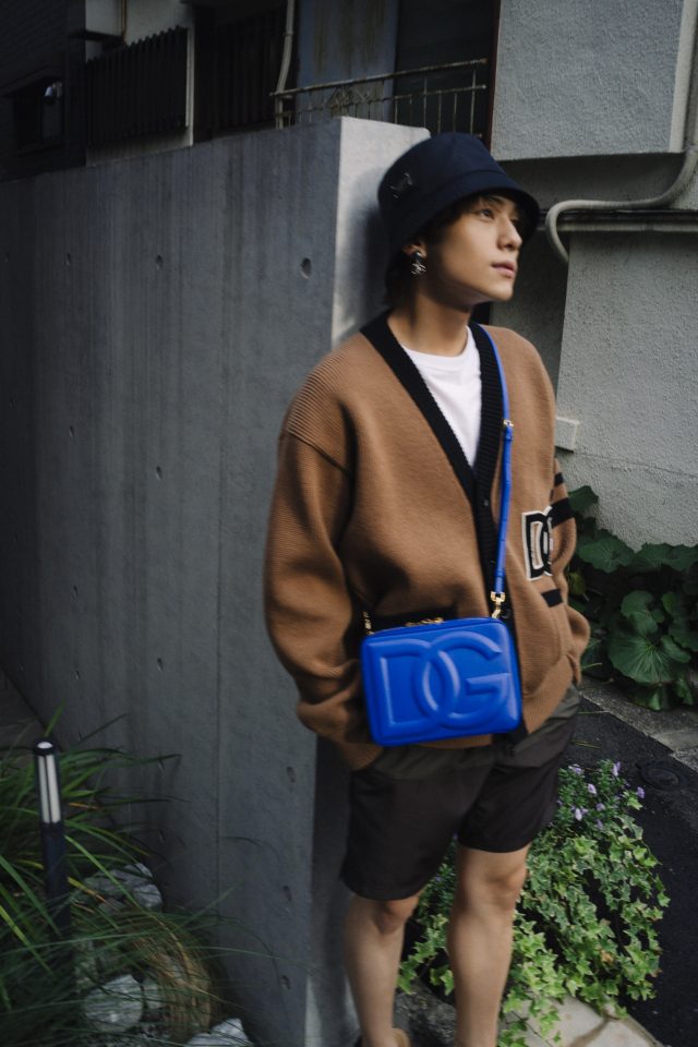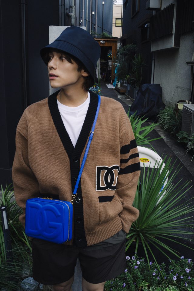 バッグ DGロゴバッグ(カメラバッグ ミディアム)¥203,500、カーディガン¥226,600、クルーネックTシャツ ¥48,400、スイムウェア ¥101,200、レザーサンダル ¥94,600、バケットハット ¥53,900、シングルイヤリング¥31,900/すべてDolce&Gabbana (ドルチェ&ガッバーナ/ドルチェ&ガッバーナ ジャパン)