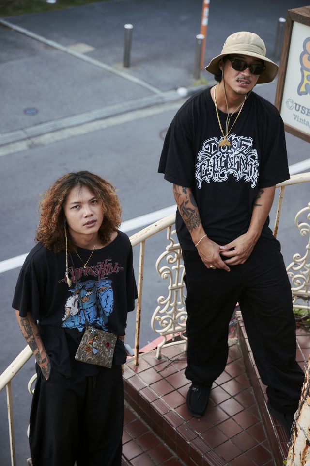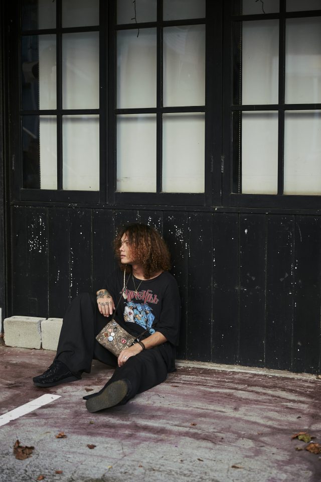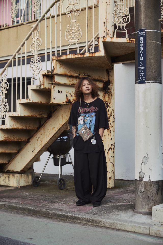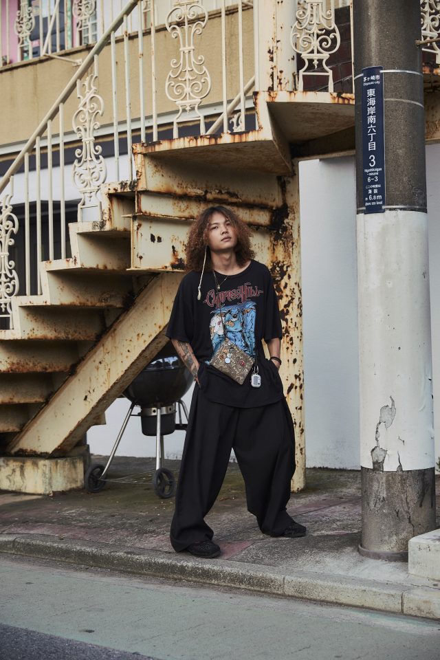 トップス/CYPRESS HILL (サイプレスヒル)、ボトムス/AJOBYAJO (アジョバイアジョ)、シューズ/CLARKS (クラークス)、ネックレス/DILL (ディル)、バック/ BLUELAB (ブルーラボ)