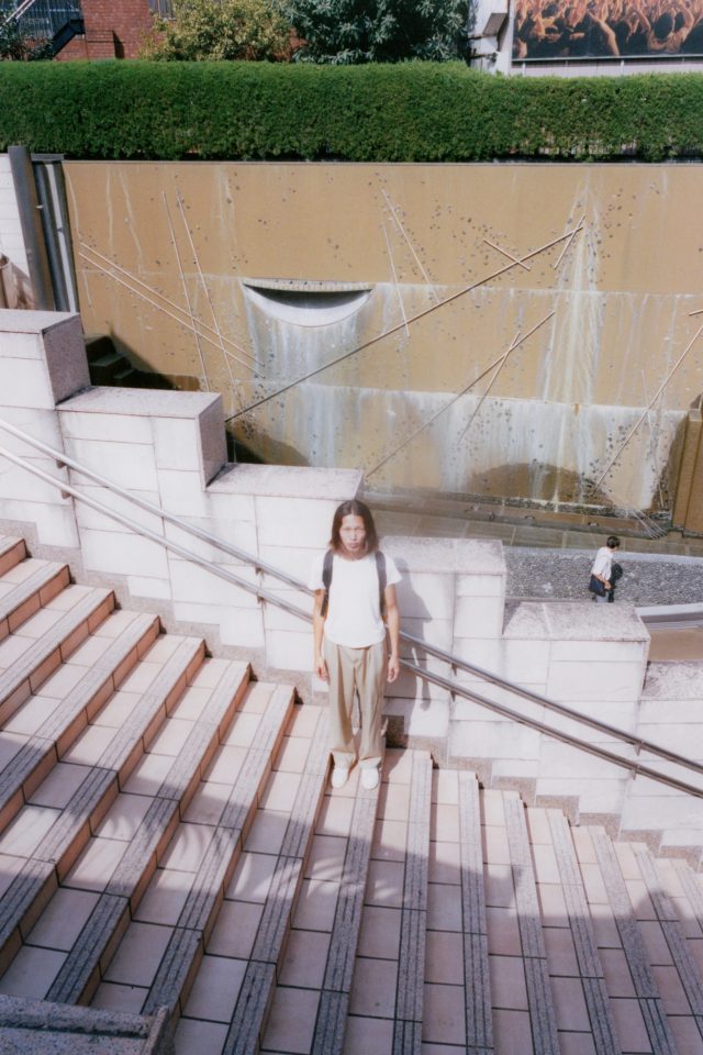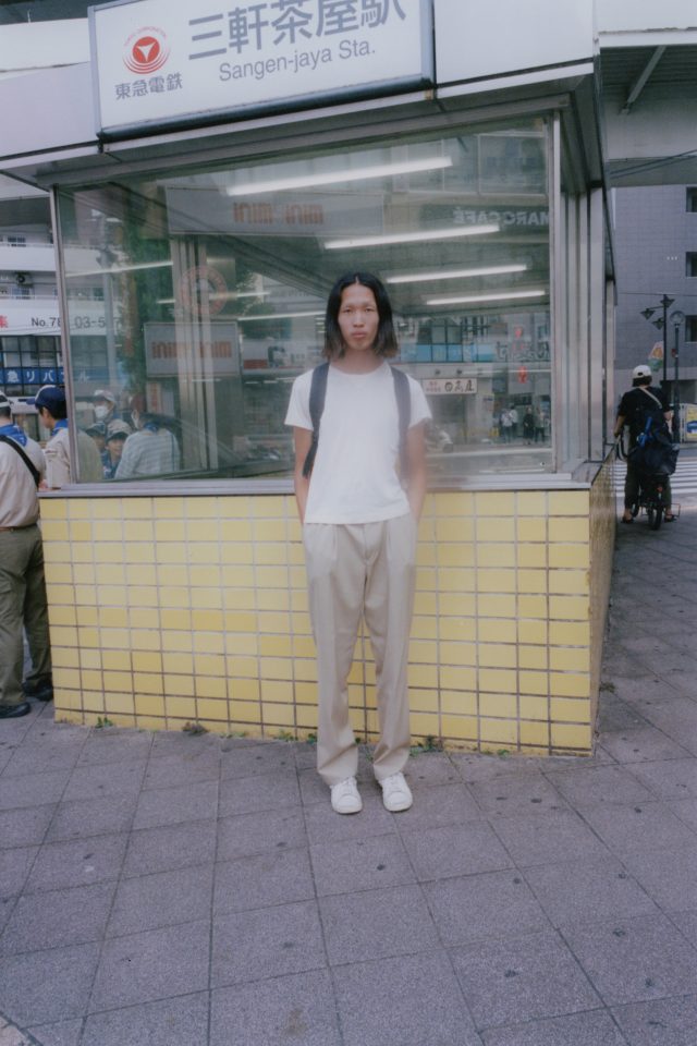 T シャツ/BOTTEGA VENETA (ボッテガ・ヴェネタ)、パンツ/AURALEE (オーラリー)、スニーカー/adidas (アディダス)