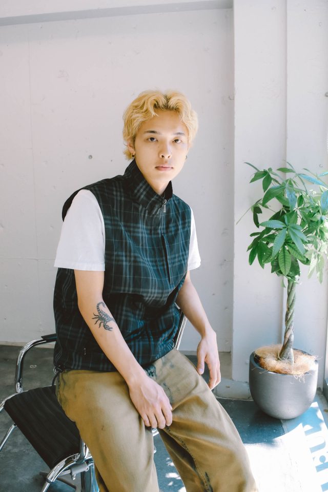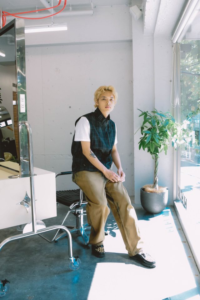 Tシャツ/OUR LEGACY(アワーレガシー)、ベスト/Burberry (バーバリー)、パンツ/MARKAWARE(マーカーウェア)、シューズ/G.H.BASS (ジーエイチバス)