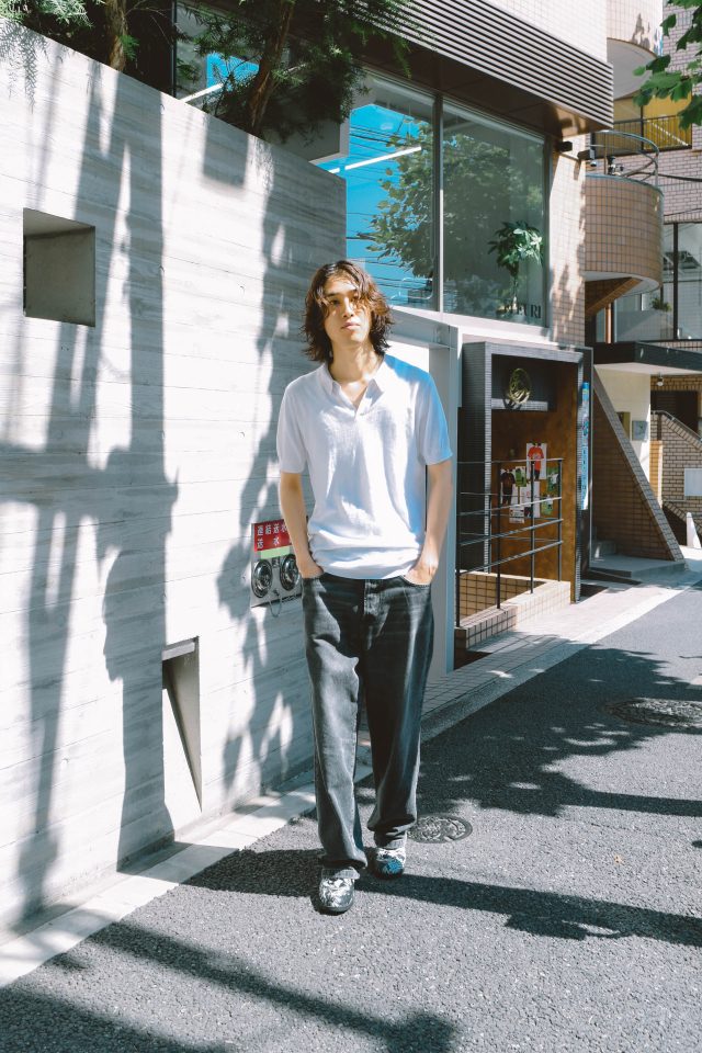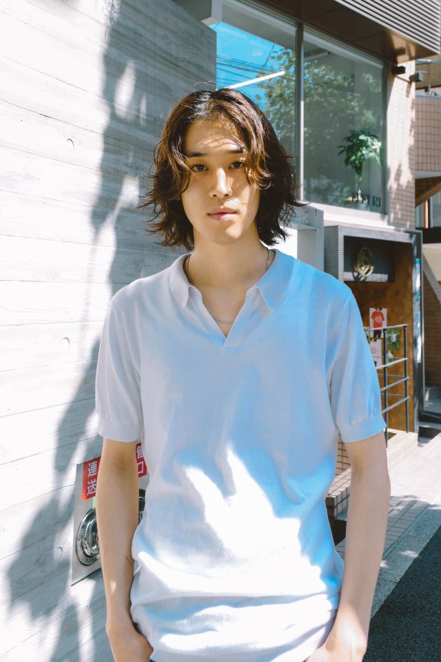 トップス/JOHN SMEDLEY(ジョンスメドレー)、パンツ/Acne Studios (アクネ ストゥディオズ )、シューズ/PACCBET(ラスベート)、アクセサリー/ALL BLUES(オール ブルース)