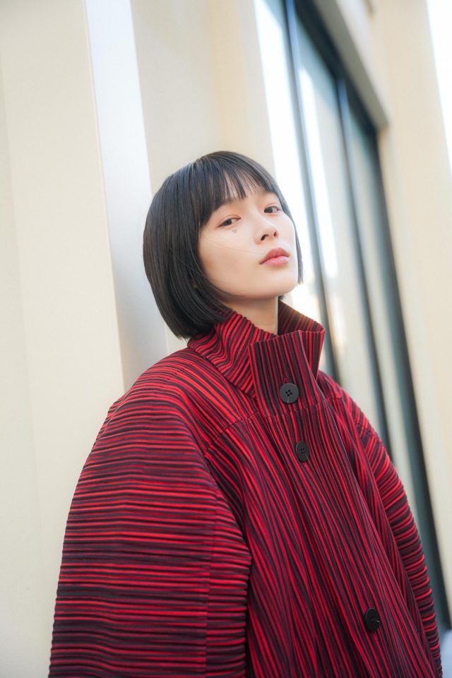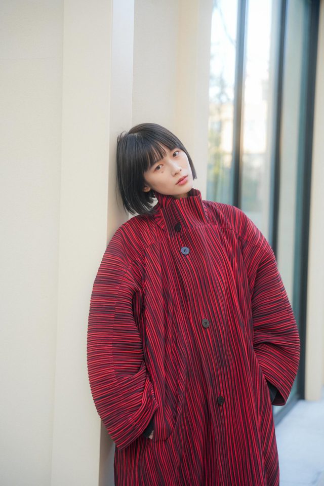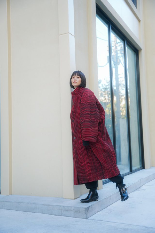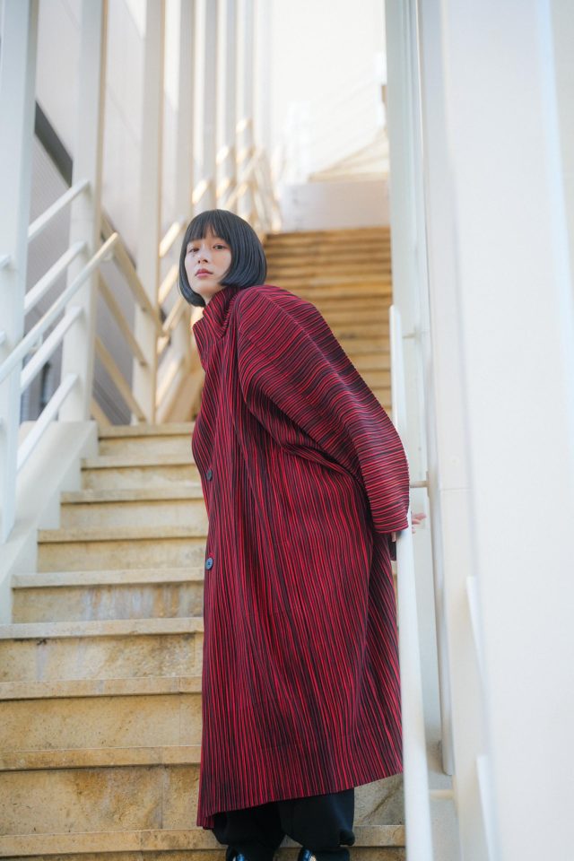 コート/ISSEY MIYAKE(イッセイミヤケ)、スウェット/No Brand(ノーブランド)、パンツ/Irrot(イロット)、ブーツ/TOGA(トーガ)