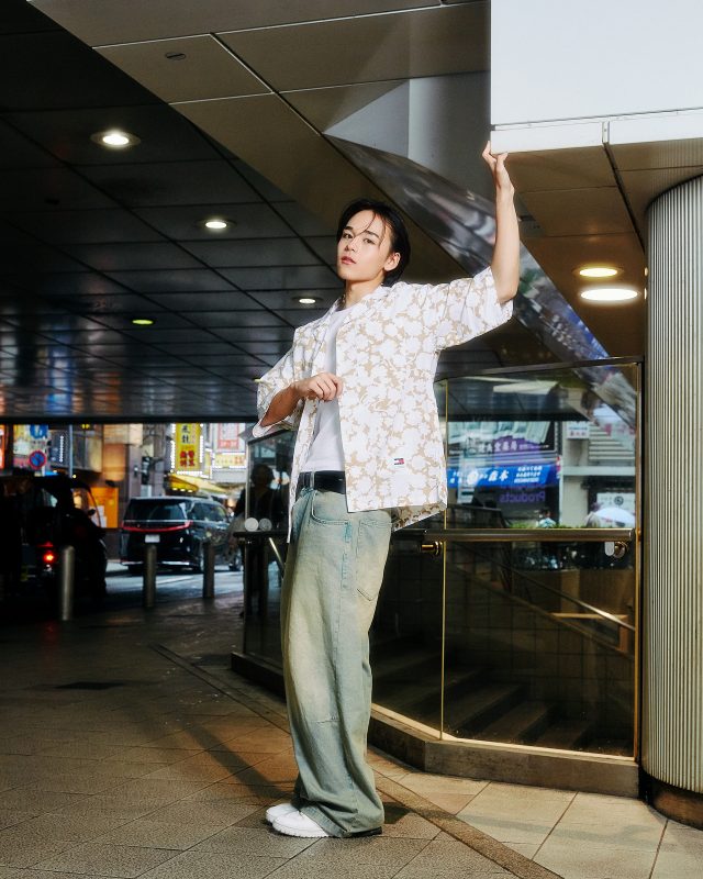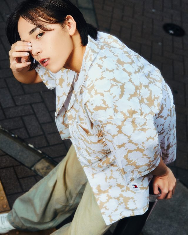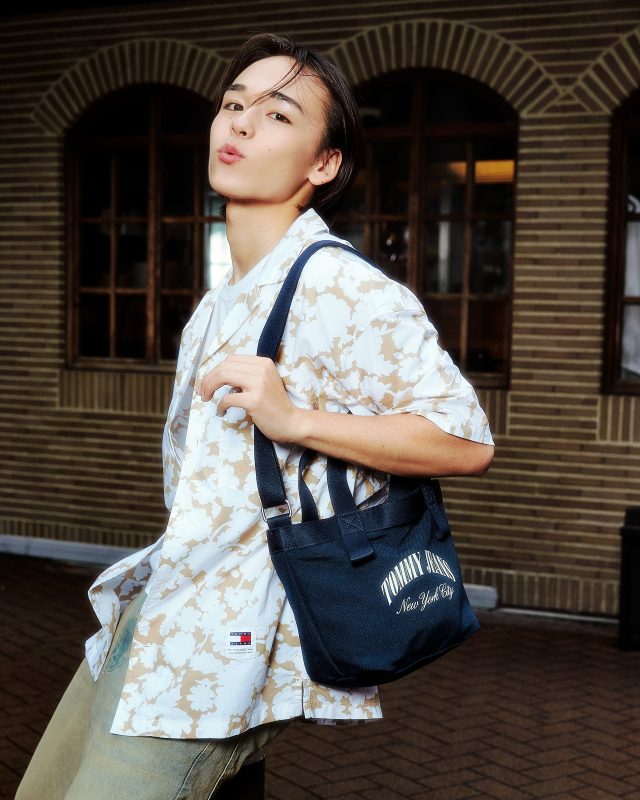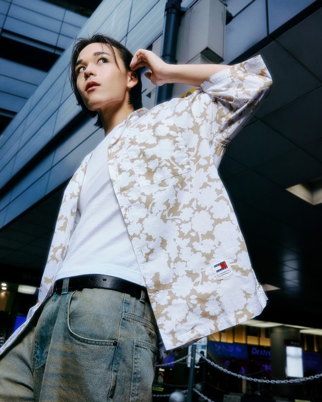 リラックスフローラルプリントキャンプシャツ ¥11,000、ホットサマーミニトートバッグ ¥11,000/TOMMY JEANS (トミー ジーンズ)、その他本人私物