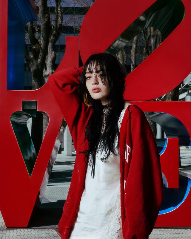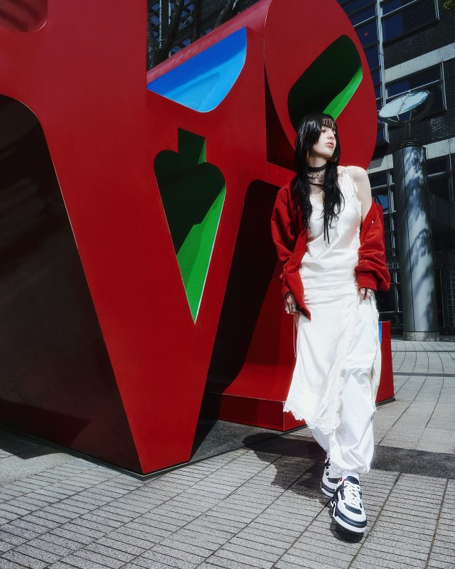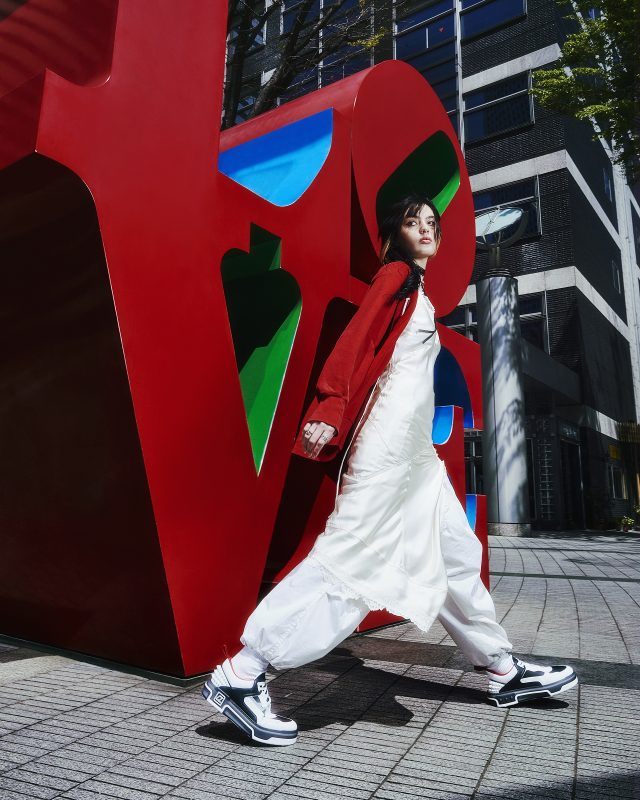 Keito が 「ASTROLOUBI」に合わせたのは、ホワイトのレースワンピースとカーゴパンツ。トーンオントーンで綺麗めにまとめあげながらも「ASTROLOUBI」のレッドソールとリンクさせた赤のフーディーでカジュアルさをプラス。スポーティでパワフルな存在感を放つスニーカーでストリートスタイルを格上げ!