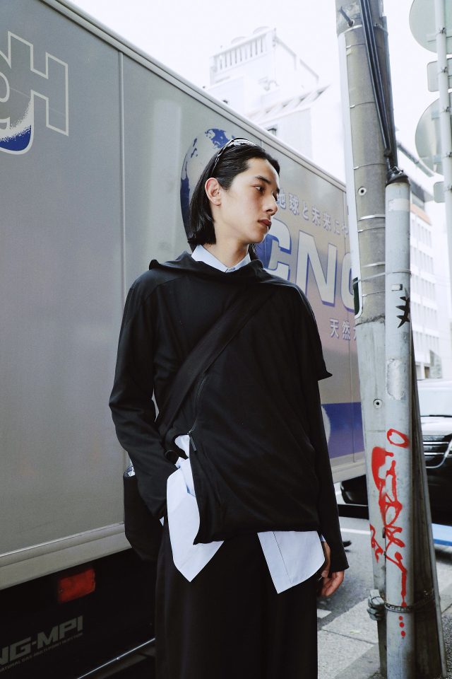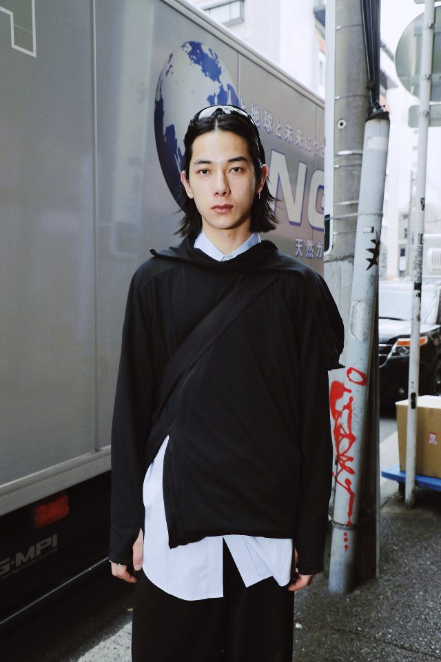 トップス/POST ARCHIVE FACTION (ポスト アーカイブ ファクション)、シャツ、リング/Vintage、パンツ/Camphor Wood (カンファーウッド)、シューズ/NIKE (ナイキ)、バッグ/K8.0、サングラス/OAKLEY (オークリー)