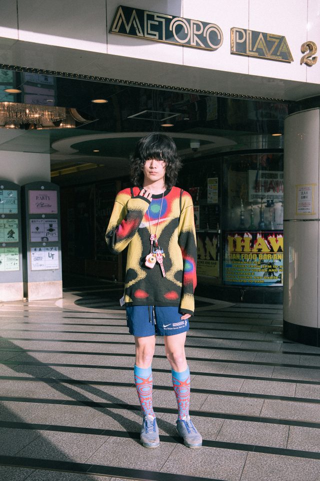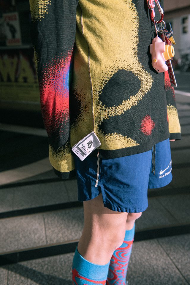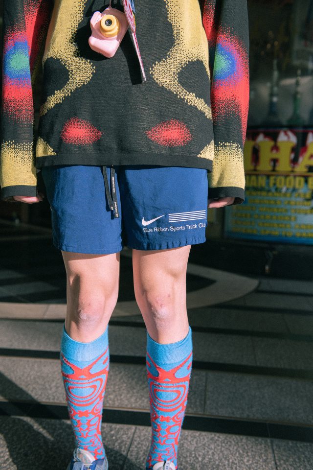 トップス/NIKE × PATTA (ナイキ×パタ)、パンツ、シューズ、バッグ/NIKE (ナイキ)、ソックス、トイカメラにつけたストラップ/Charles Jeffrey LOVERBOY (チャールズ・ジェフェリー・ラバーボーイ)