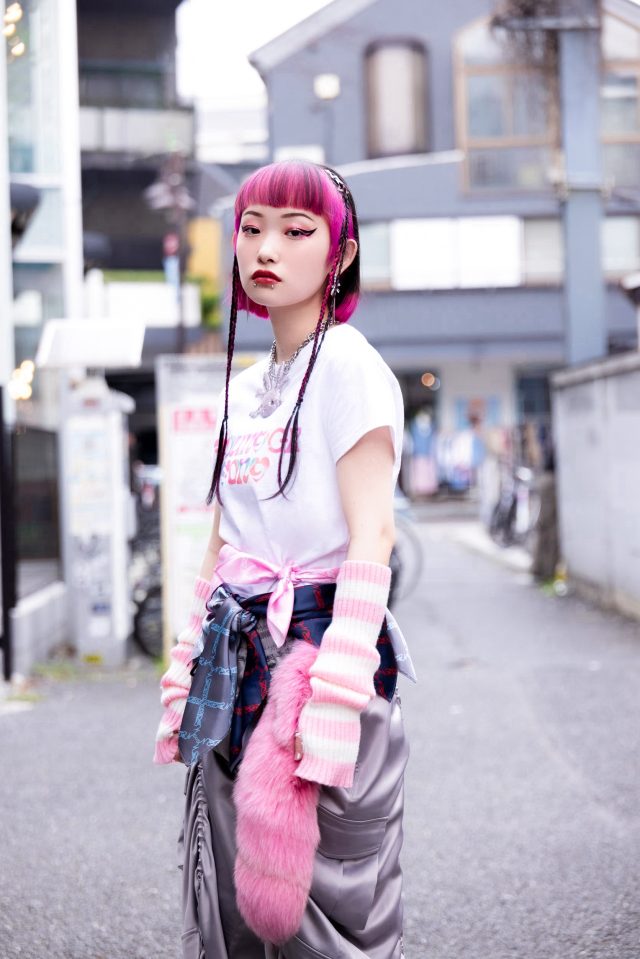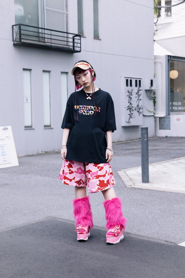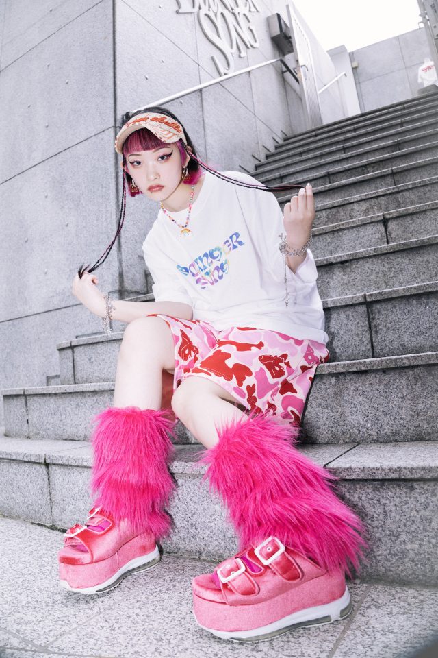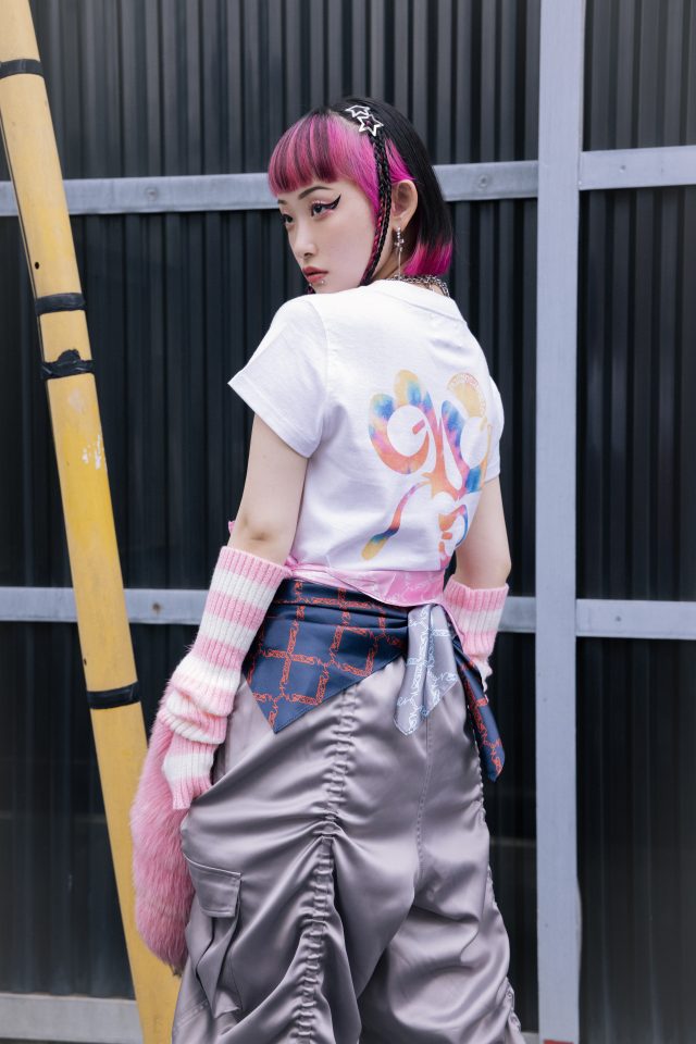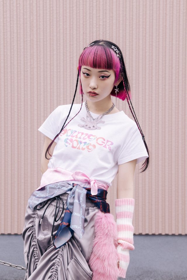 ZONe × Younger Song クロップド Tee (タイダイピンク) ¥5,900/Youngersong (ヤンガーソング)、パンツ ¥28,600、スカーフ(ピンク・ネイビー・シルバー)各¥4,950、シューズ ¥37,400/すべて PAMEO POSE (パメオポーズ)