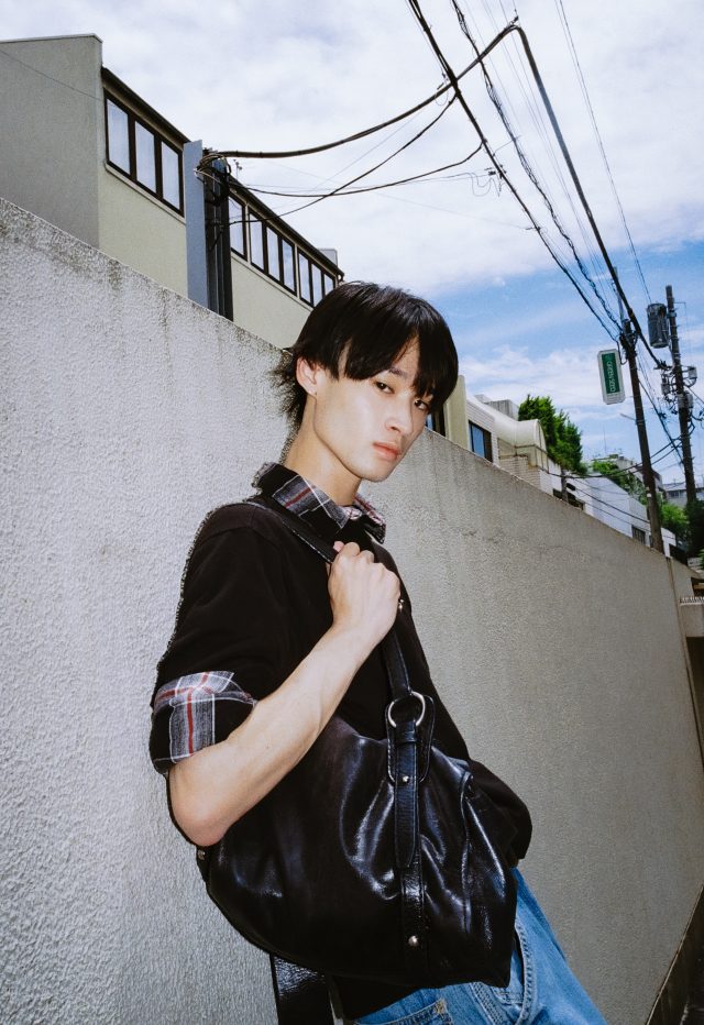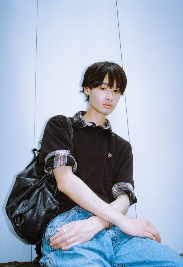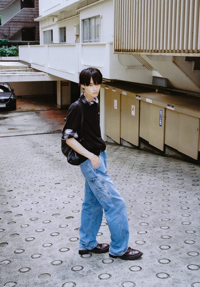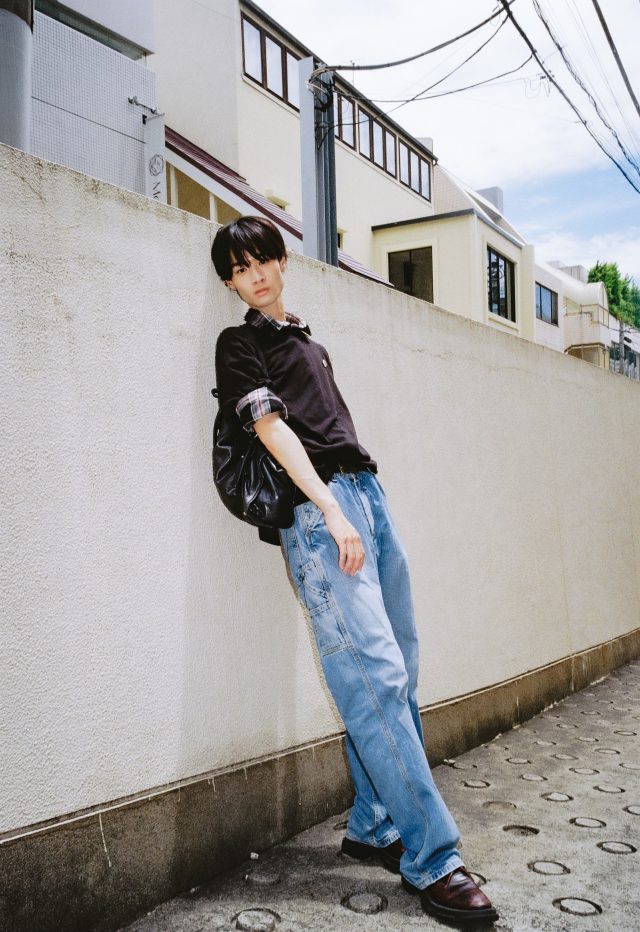 トップス/UNIQLO (ユニクロ)、シャツ/Lui’s (ルイス)、パンツ/Levi’s (リーバイス)、シューズ/Both × Second Layer (ボース × セカンドレイヤー)、バッグ/MIU MIU (ミュウミュウ)、ピンバッチ/GIRLS FIGHT CLUB (ガールズファイトクラブ)、ネクタイピン/Paul Smith (ポール・スミス)、ブレスレット/TAKEO KIKUCHI (タケオキクチ)