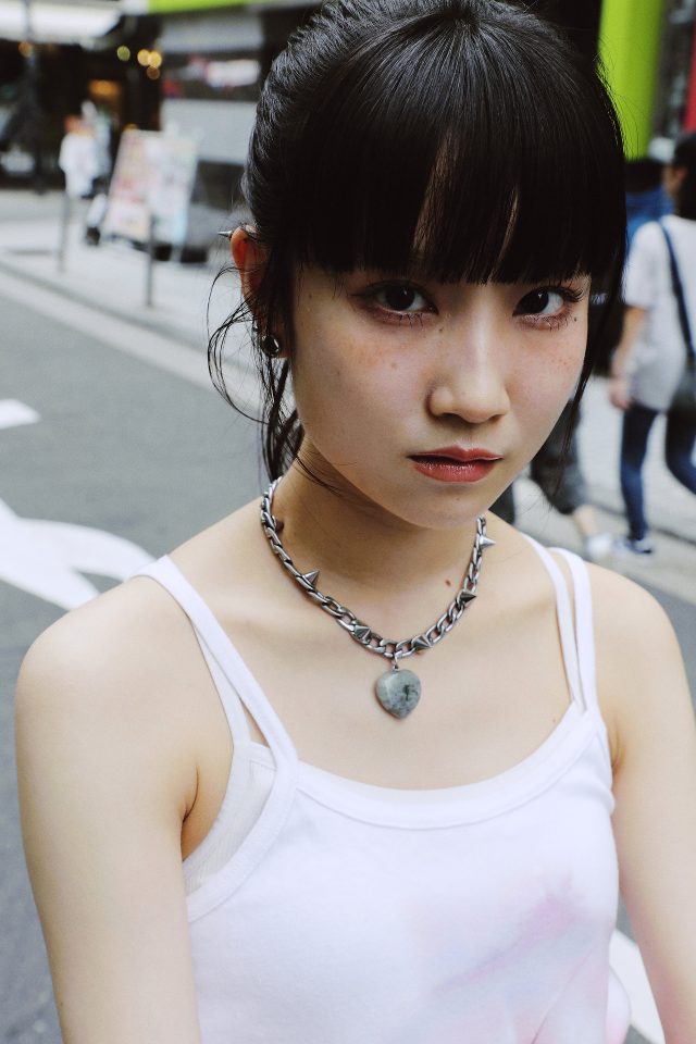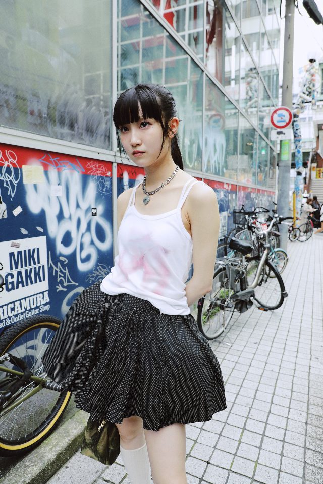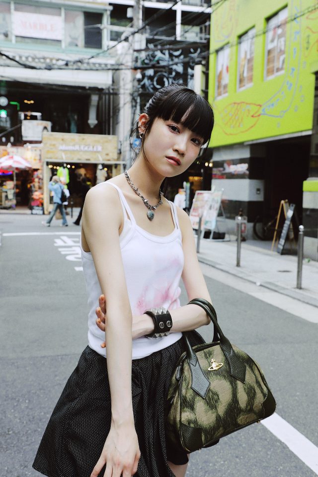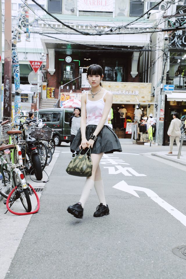 トップス/Elle Teresa × AsahiNa (エル テレサ × アサヒナ)、スカート/Ans Dotsloevner (アンス ドッツローヴナー)、シューズ/NIKE (ナイキ)、ソックス、バッグ/Vivienne Westwood (ヴィヴィアン・ウェストウッド)、ネックレス/MOMENTEL (モーメンタル)