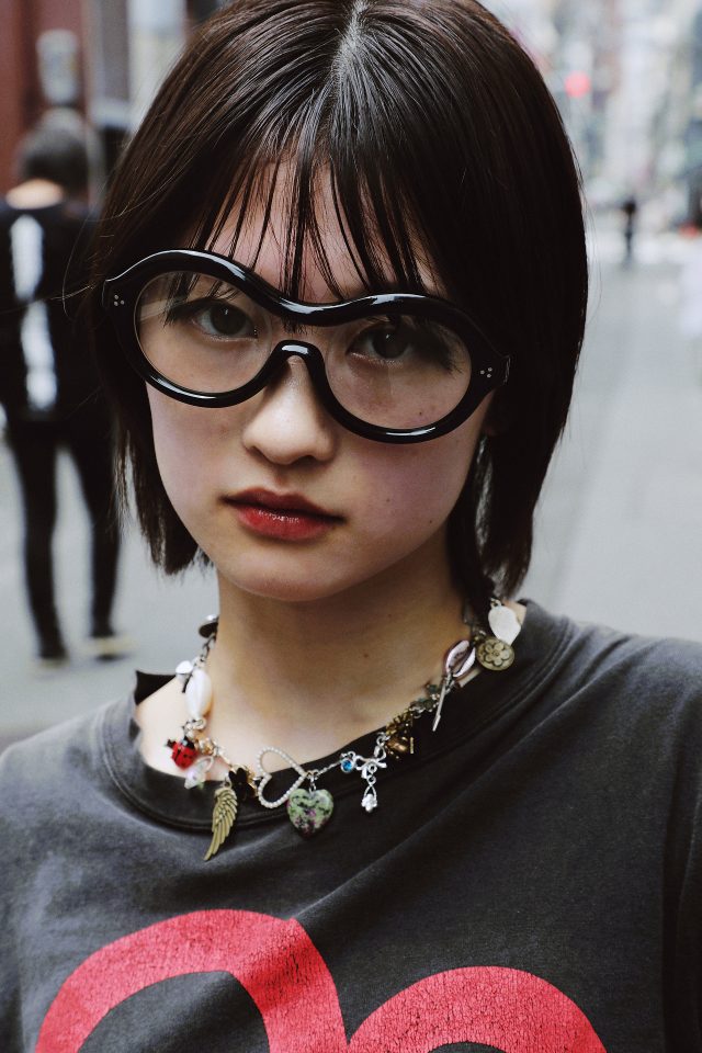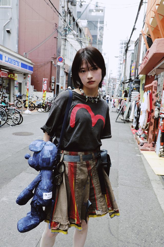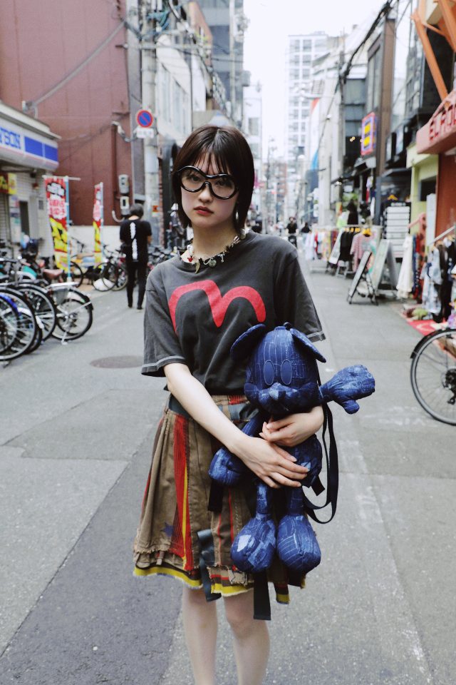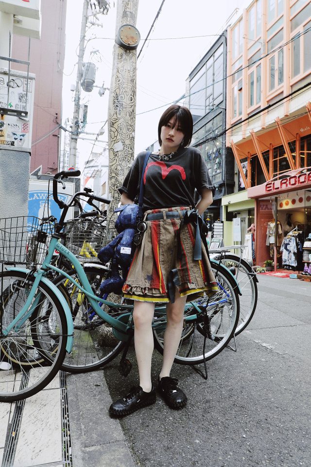 トップス/EVISU (エヴィス)、スカート/MARITHE + FRANCOIS GIRBAUD (マリテフランソワジルボー)、シューズ/NIKE x JACQUEMUS (ナイキ x ジャックムス)、メガネ/Mukta (ムクタ)