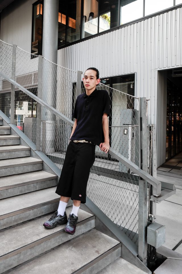 トップス/kolor (カラー)、パンツ/Dickies (ディッキーズ)、シューズ/ASICS (アシックス)
