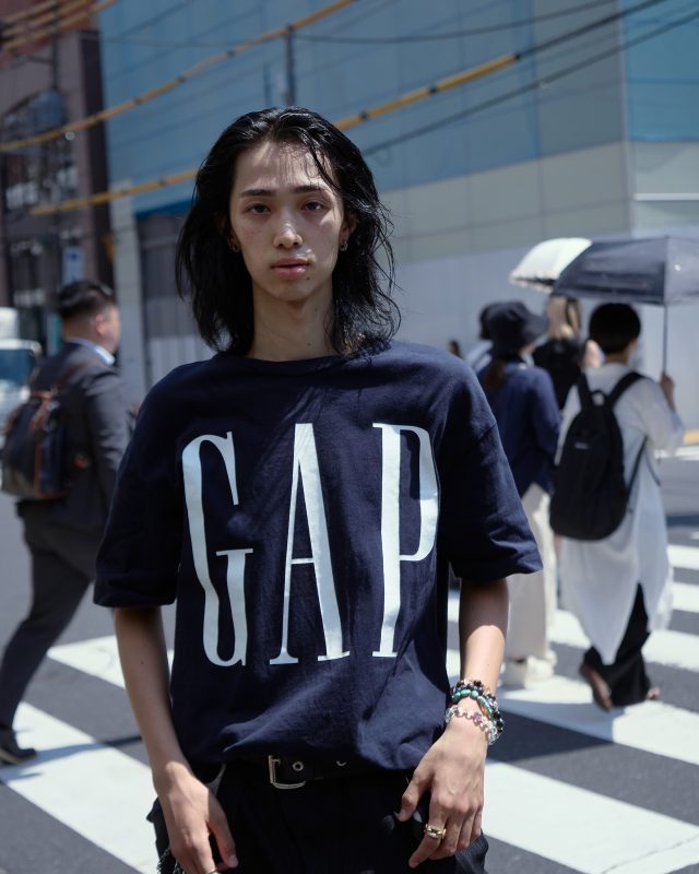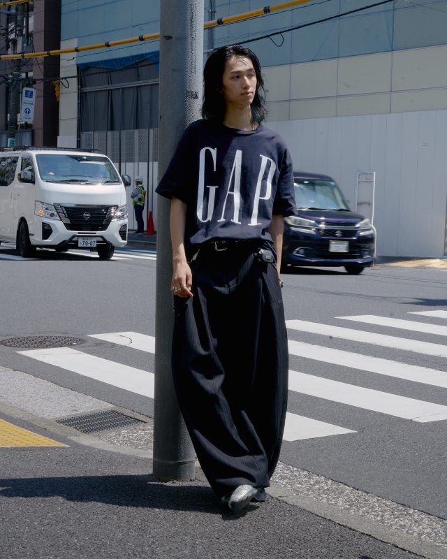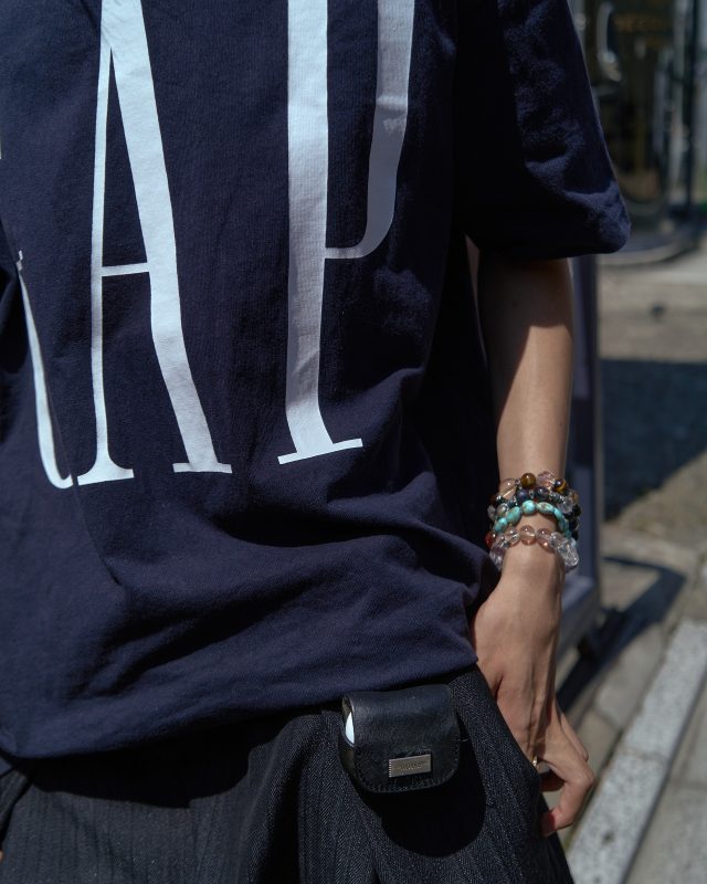 トップス/GAP (ギャップ)、パンツ/ADERERROR (アーダーエラー)、シューズ/CHANEL (シャネル)、ベルト/Vivienne Westwood (ヴィヴィアン・ウエストウッド)、ウォルトチェーン/C2h4 (シーツーエイチフォー)、リング/AMBUSH (アンブッシュ)