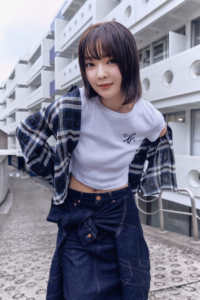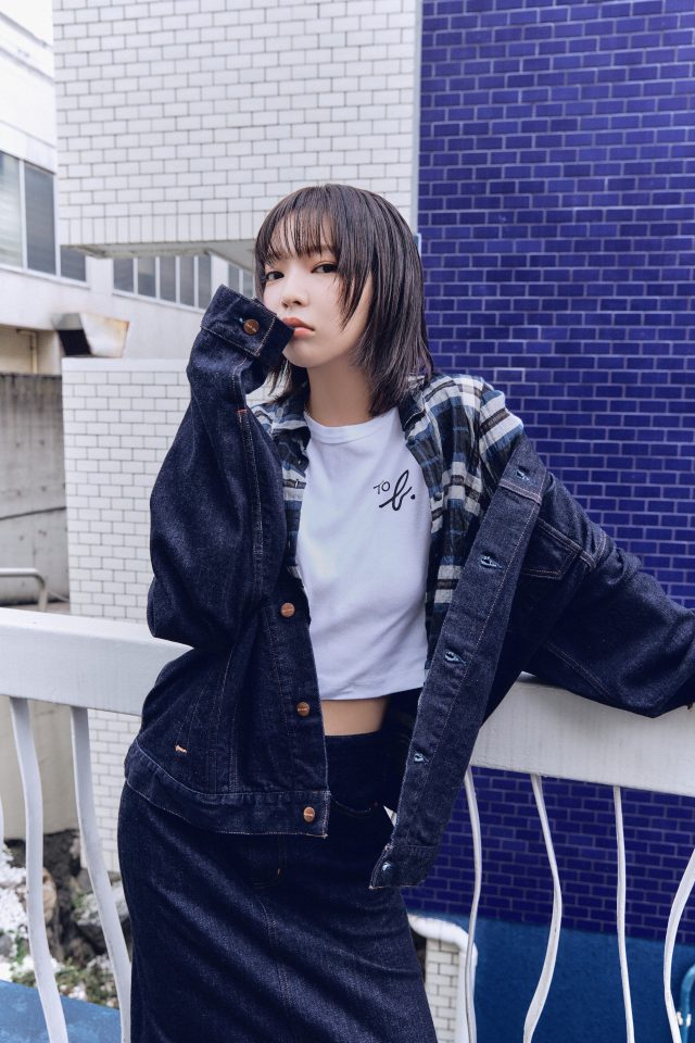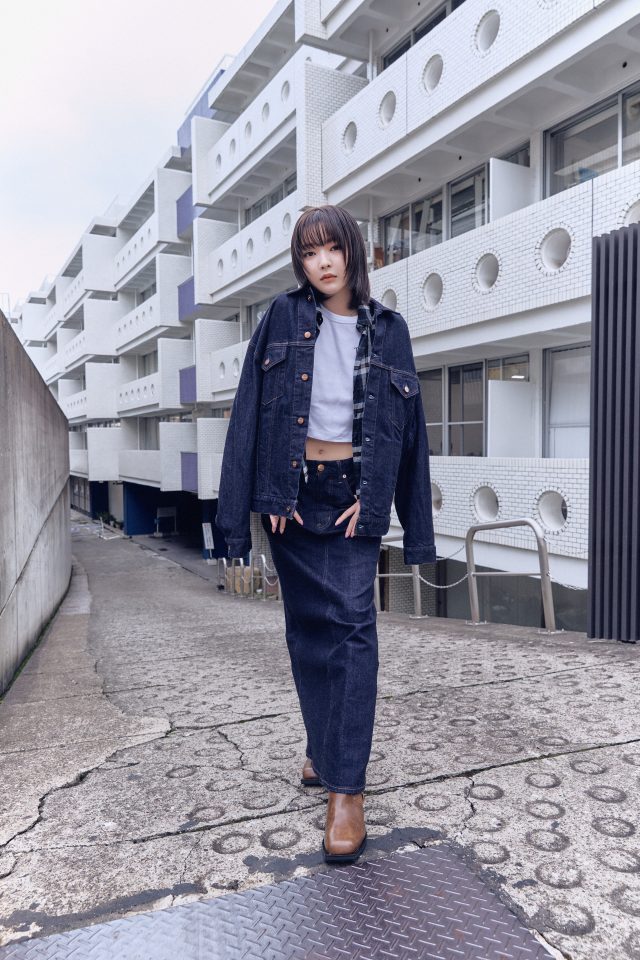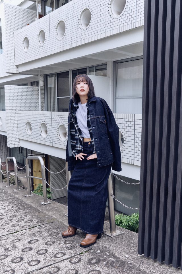 デニムジャケット¥40,700、Tシャツ¥6,930、チェックシャツ ¥25,300、スカート ¥26,400/全てTo b. by agnès b. (トゥービー バイ アニエスベー)、その他スタイリスト私物