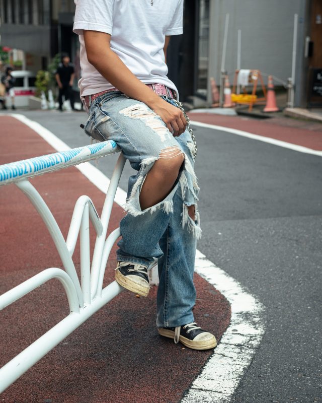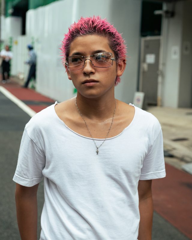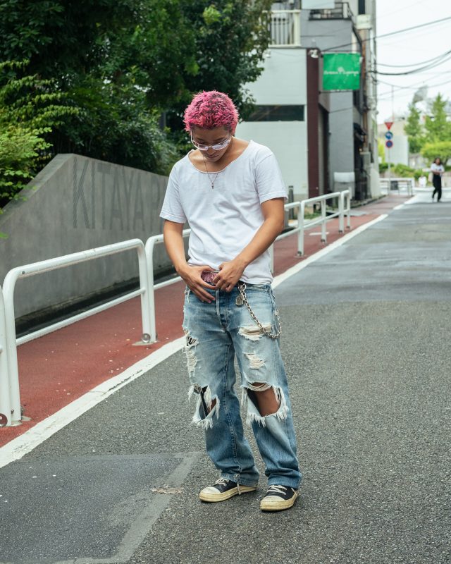 トップス/Costco (コストコ)、パンツ/EVISU (エヴィス)、靴/Rick Owens (リック・オウエンス)、サングラス/Black Flys (ブラックフライズ)、ネックレス/Chrome Hearts (クロムハーツ)、アクセサリー/BOTTEGA VENETA (ボッテガ・ヴェネタ)
