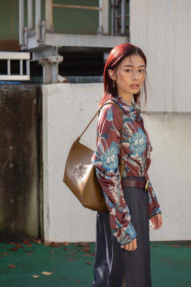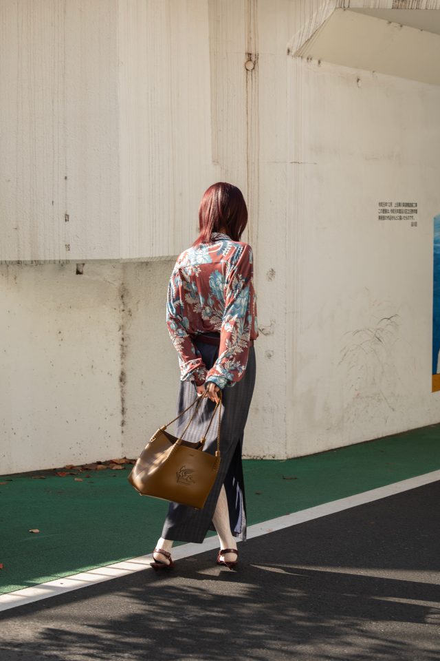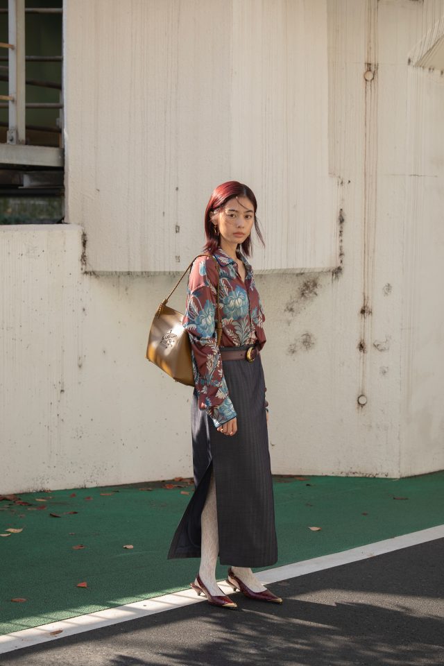 シャツ ¥309,100、スカート ¥213,400、ベルト¥110,000、シューズ ¥165,000、ピアス ¥44,000、バングル¥165,000/すべてETRO (エトロ)、その他スタイリスト私物