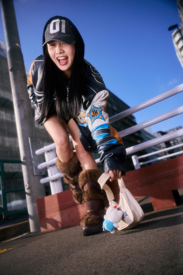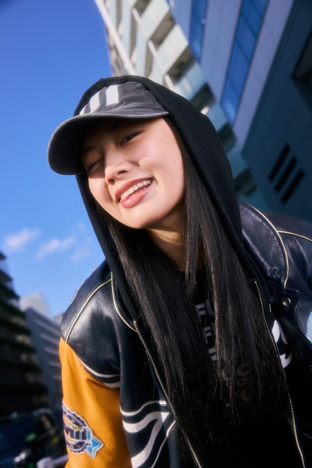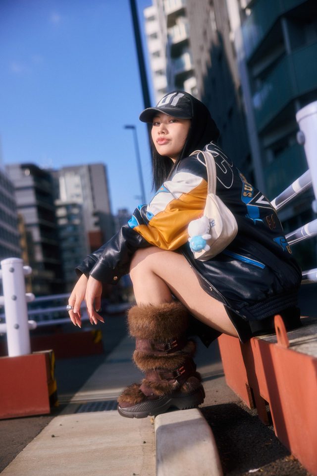 ジャケット/BOW CITY (バウ シティー)、パーカー/DSV (ディーエスブイ)、トップス/ Lovekiller (ラブキラー)、パンツ/SHEIN (シーイン)、ブーツ/YELLO (イエロ)、バッグ/Praying (プレイング)、バッグに付けたキティ/DELIGHTPOOL (ディライトプール)、キャップ/mark point (マークポイント)、リング/DIESEL (ディーゼル)