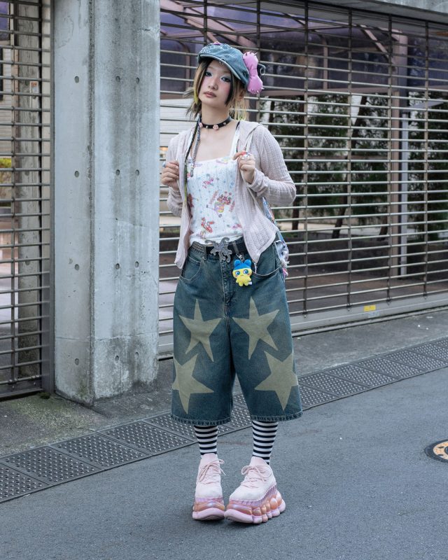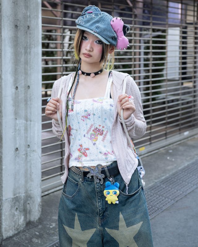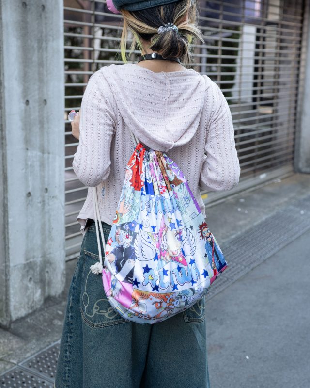 パーカー/SCULPTOR (スカルプター)、インナー/HYSTERIC GLAMOUR (ヒステリックグラマー) × Ema Gaspar (エマ・ガスパー)、ボトムス/YAMEPI© (ヤメピ) × BEAMS Future archive (ビームス フューチャー アーカイブ)、スニーカー/MIKIOSAKABE (ミキオサカべ)、リュック/Youthbath (ユースバス)