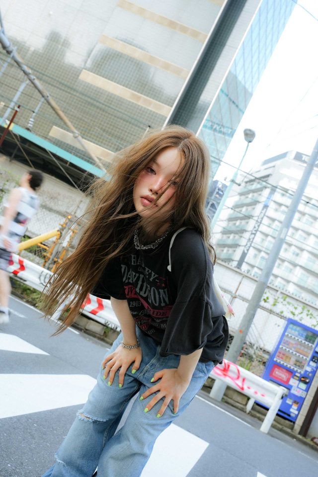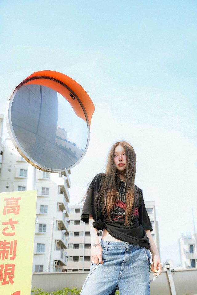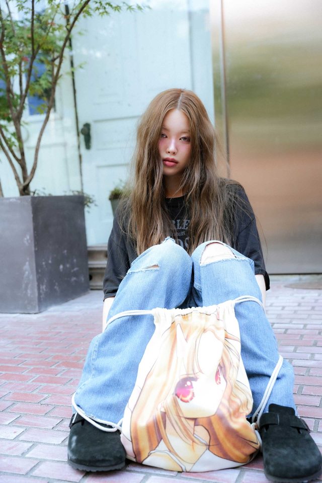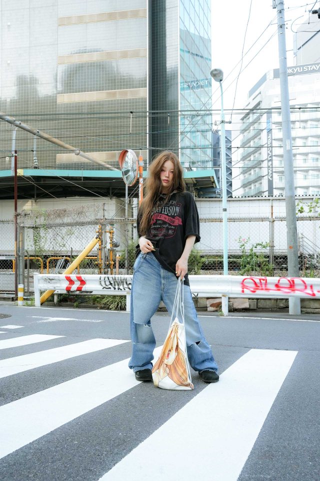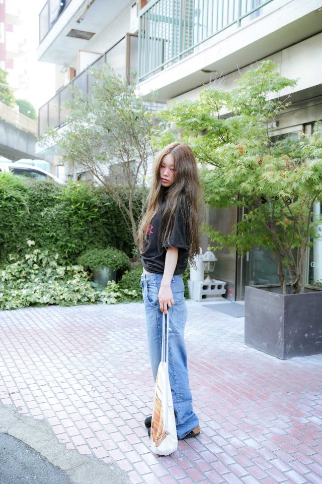 Tシャツ/Vintage (ヴィンテージ)、パンツ/Hysteric Glamour (ヒステリックグラマー)、シューズ/Brikenstock (ビルケンシュトック)、バッグ/NAVIVERSE (ナビバース)、アクセサリー/HYPNOTIZE (ヒプノタイズ)