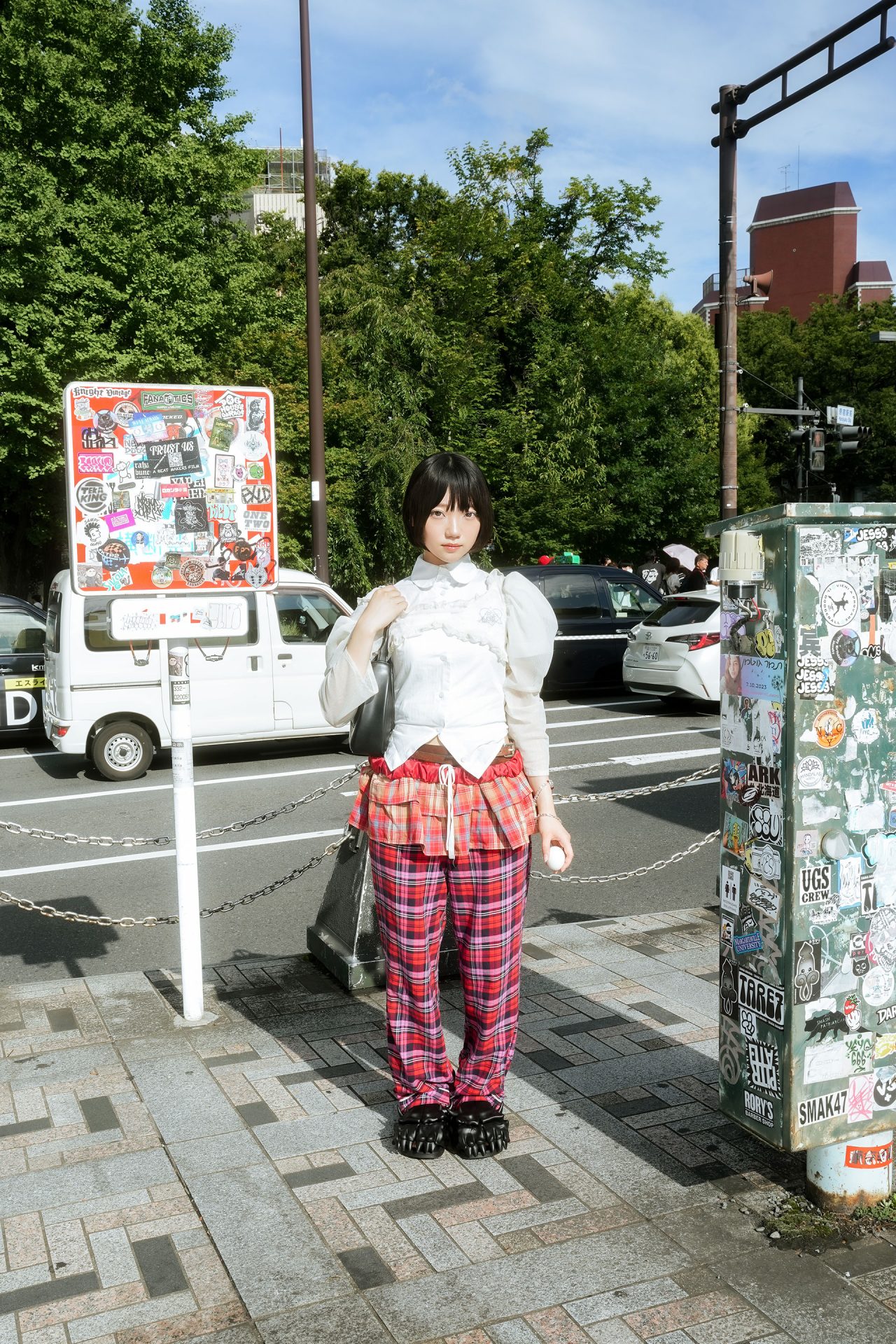 トップス/S.F sukoshifushigi (すこしふしぎ)、シャツ/Vivienne Westwood (ヴィヴィアン・ウエストウッド)、スカート/しまむら、パンツ/友達が可愛がってるパジャマ、シューズ/RCv (アールシーブイ)、キャップ/SHEEP (シープ)