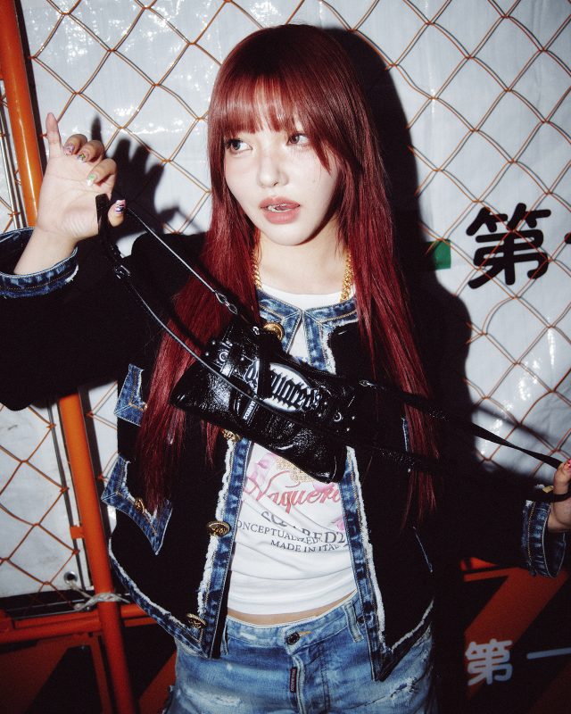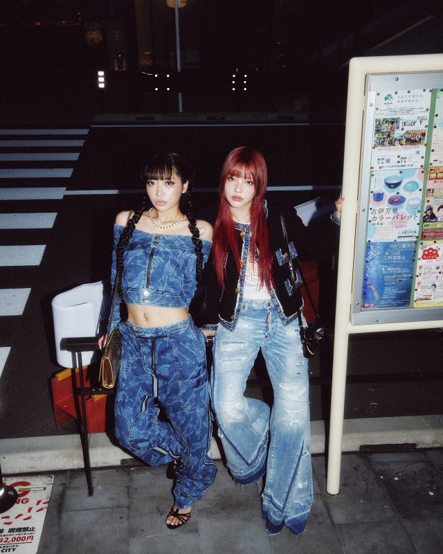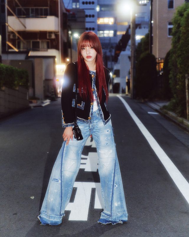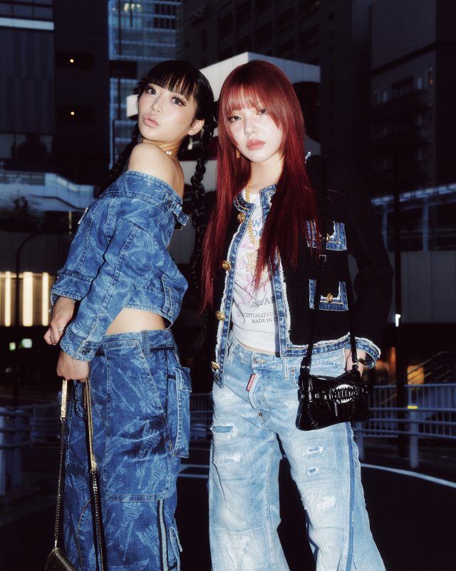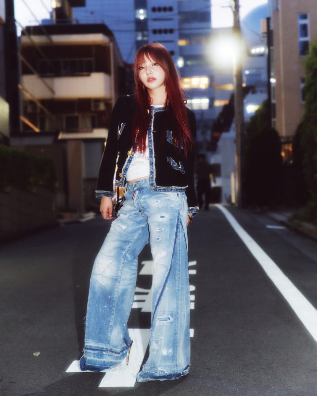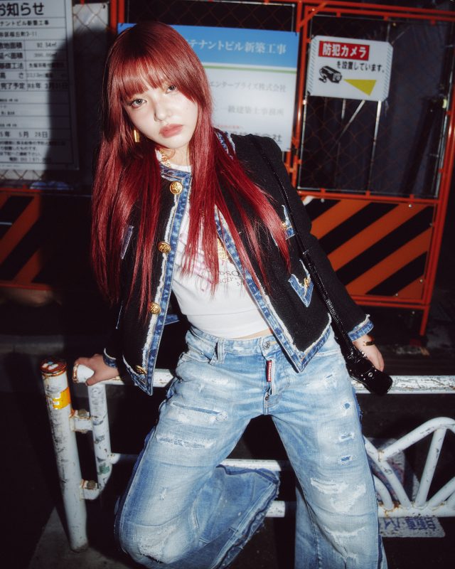 T シャツ ¥61,600/DSQUARED2 × VAQUERA (ディースクエアード × ヴァケラ)、パンツ ¥231,000/DSQUARED2 × BETTTER (ディースクエアード × ベター)、ジャケット ¥319,000、イヤリング ¥24,200、ネックレス ¥161,700、バッグ ¥157,300、ブレスレット ¥48,400、シューズ ¥210,100/DSQUARED2 (ディースクエアード)