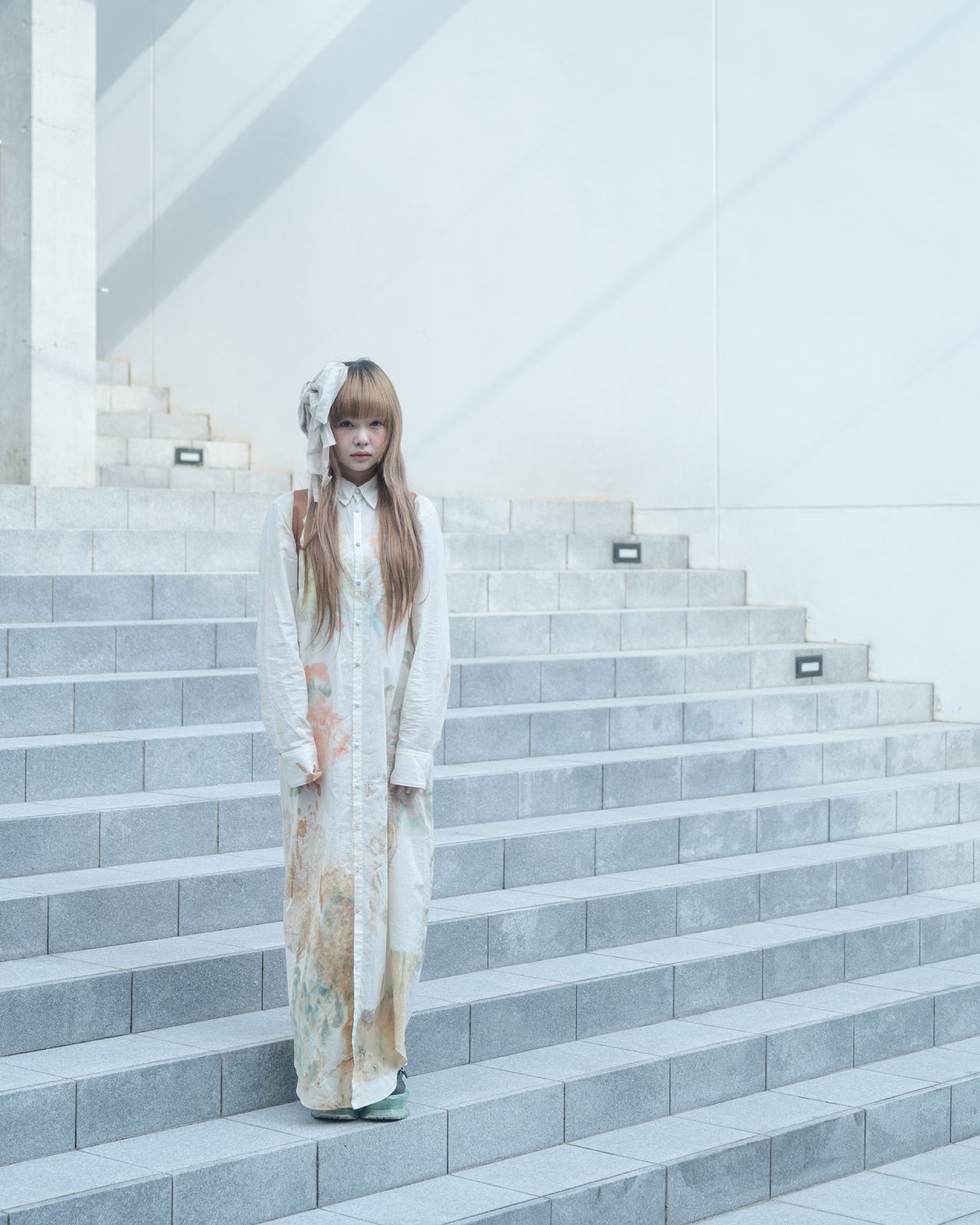 ワンピース/NOZOMI ISHIGURO (ノゾミ イシグロ)、シューズ/AKIKOAOKI (アキコアオキ)、バッグ/ノーブランド、ヘアアクセサリー/ハンドメイド