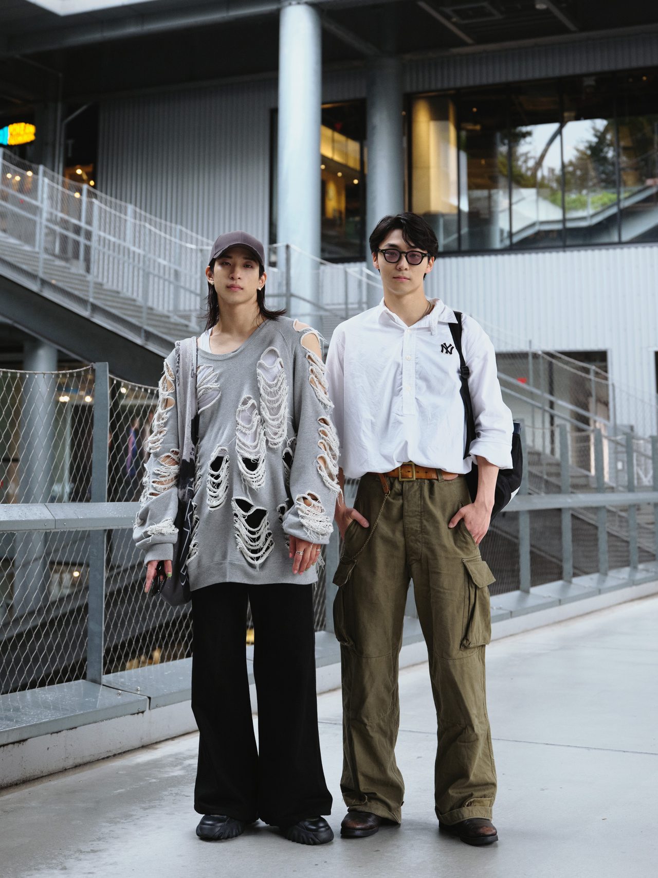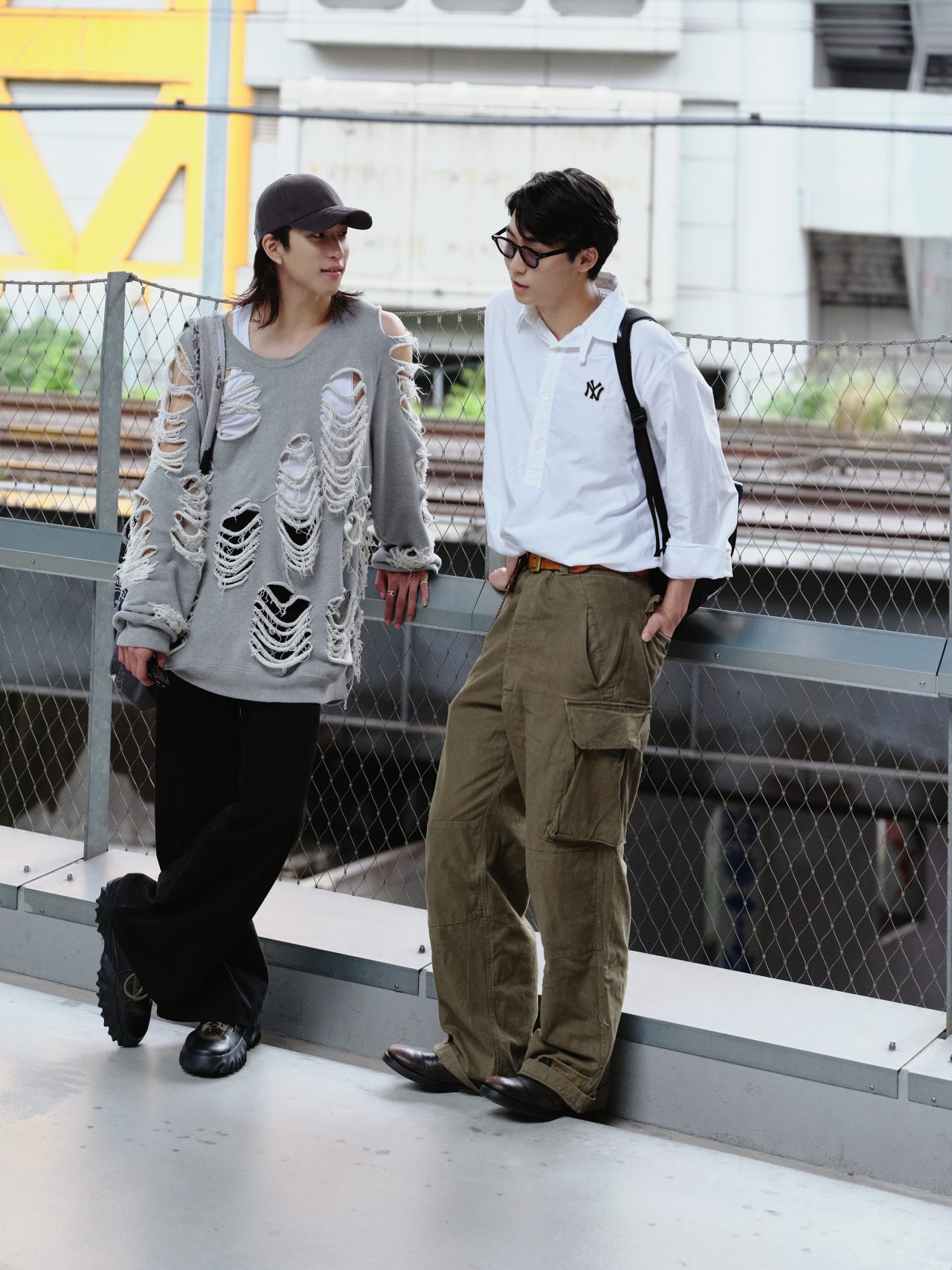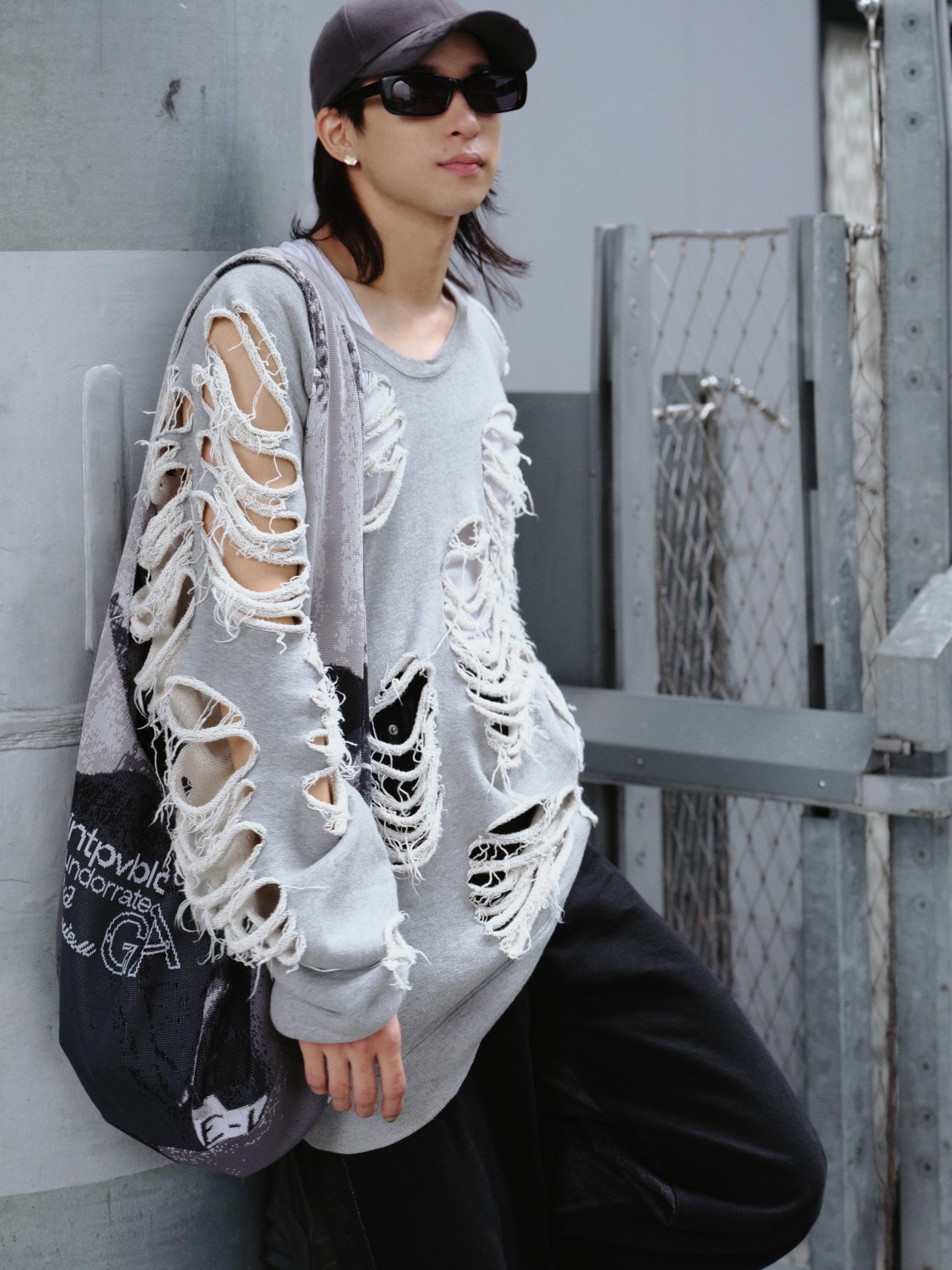 トップス/JUN NAKAYAMA (ジュンナカヤマ)、パンツ/H&M Studio (エイチアンドエム ストゥディオ)、キャップ、バッグ/
