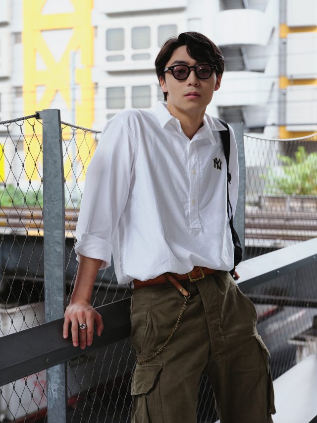 トップス/POLO RALPH LAUREN (ポロラルフローレン)、パンツ/Vintage、ブーツ/dapper’s (ダッパーズ)、サングラス/JULIUS TART OPTICAL (ジュリアス タート オプティカル)