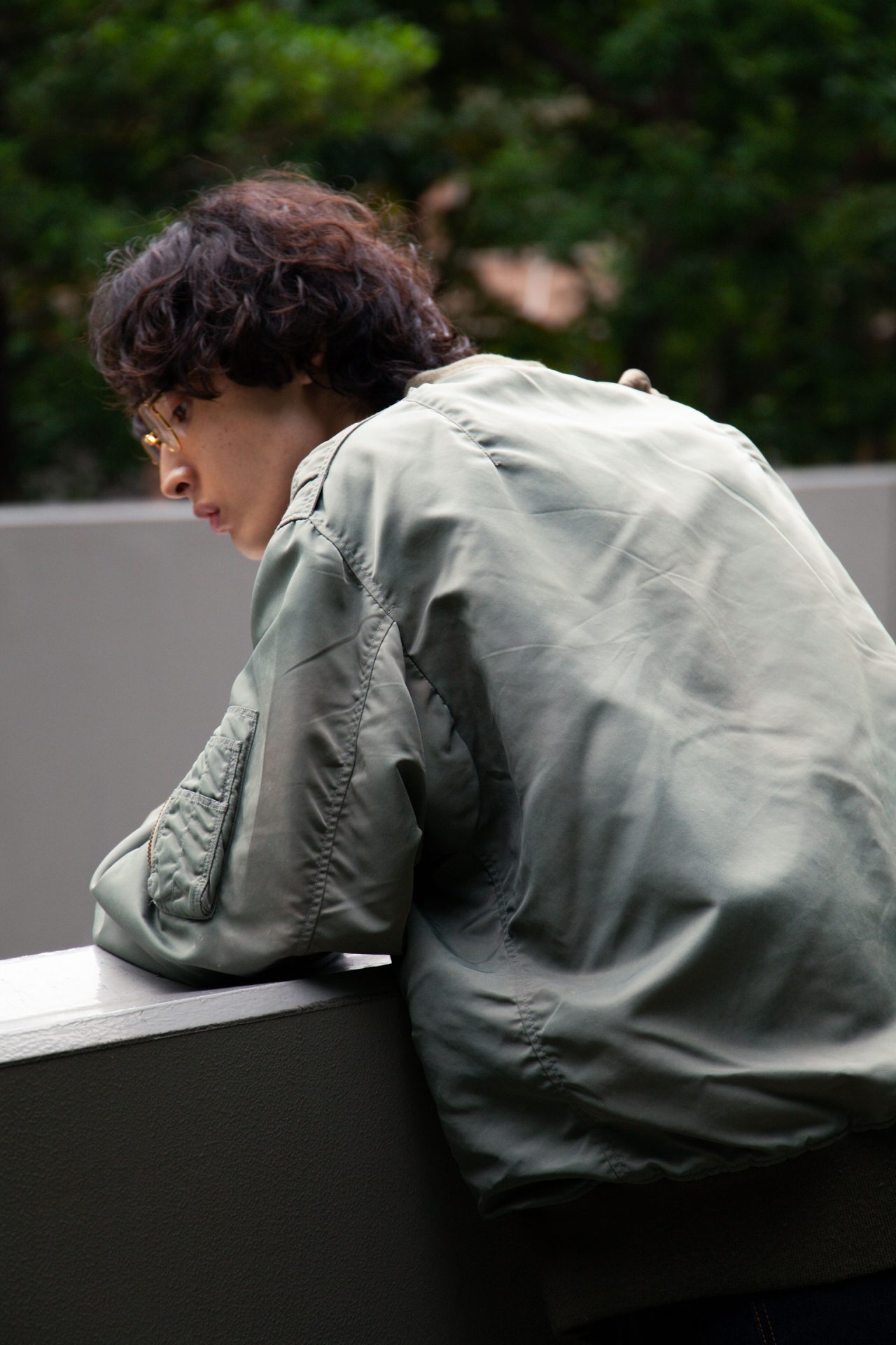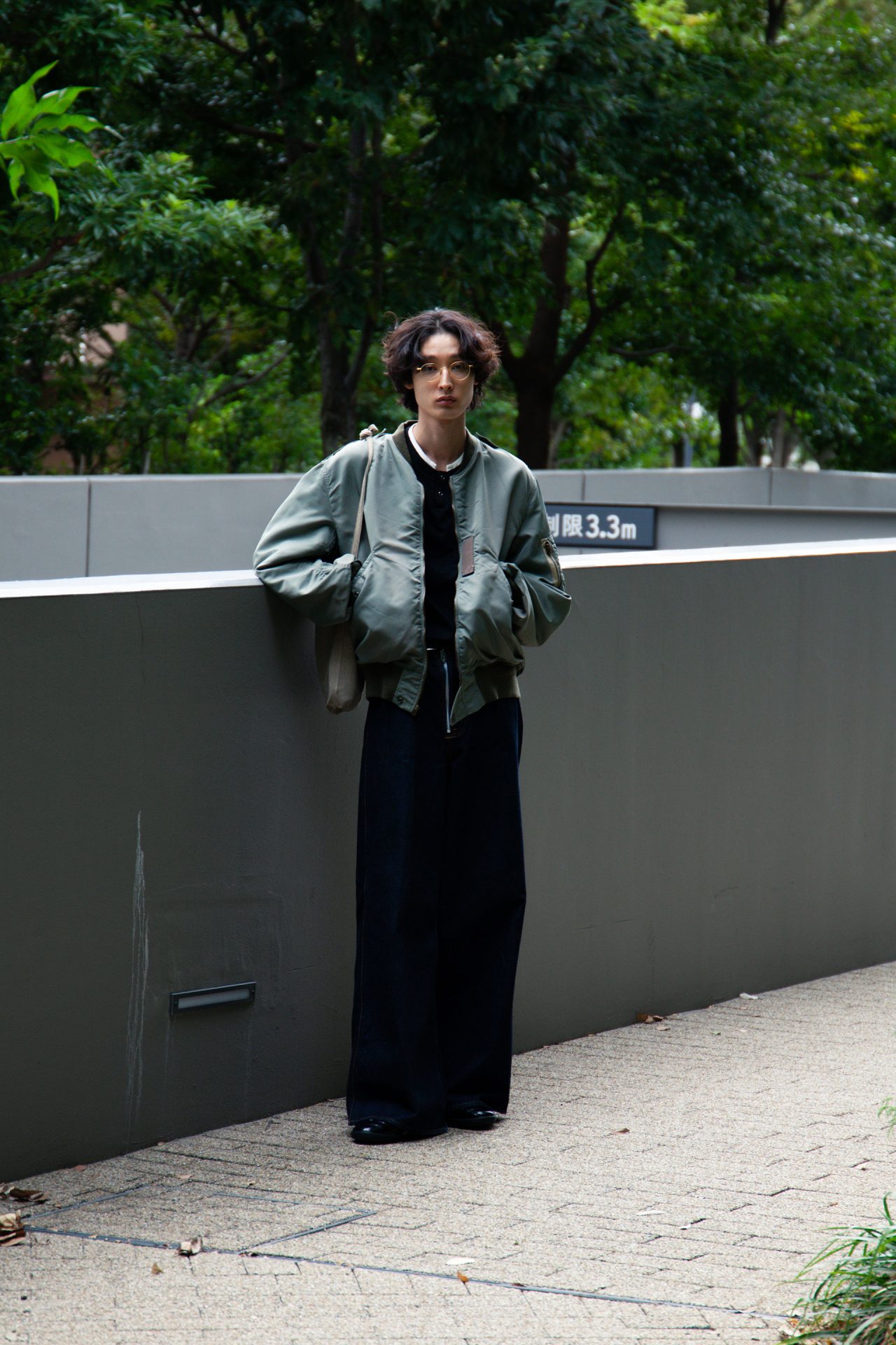 ジャケット/BOW WOW (バウ ワウ)、インナー/sairenssei (サイレンセイ)、パンツ/MASU (エムエーエスユー)、シューズ/NIKE (ナイキ)、ベルト/UNIQLO (ユニクロ)、アイウェア/ayame (アヤメ)、バッグ/Hender Scheme (エンダースキーマ)、リング/CARTIER (カルティエ)