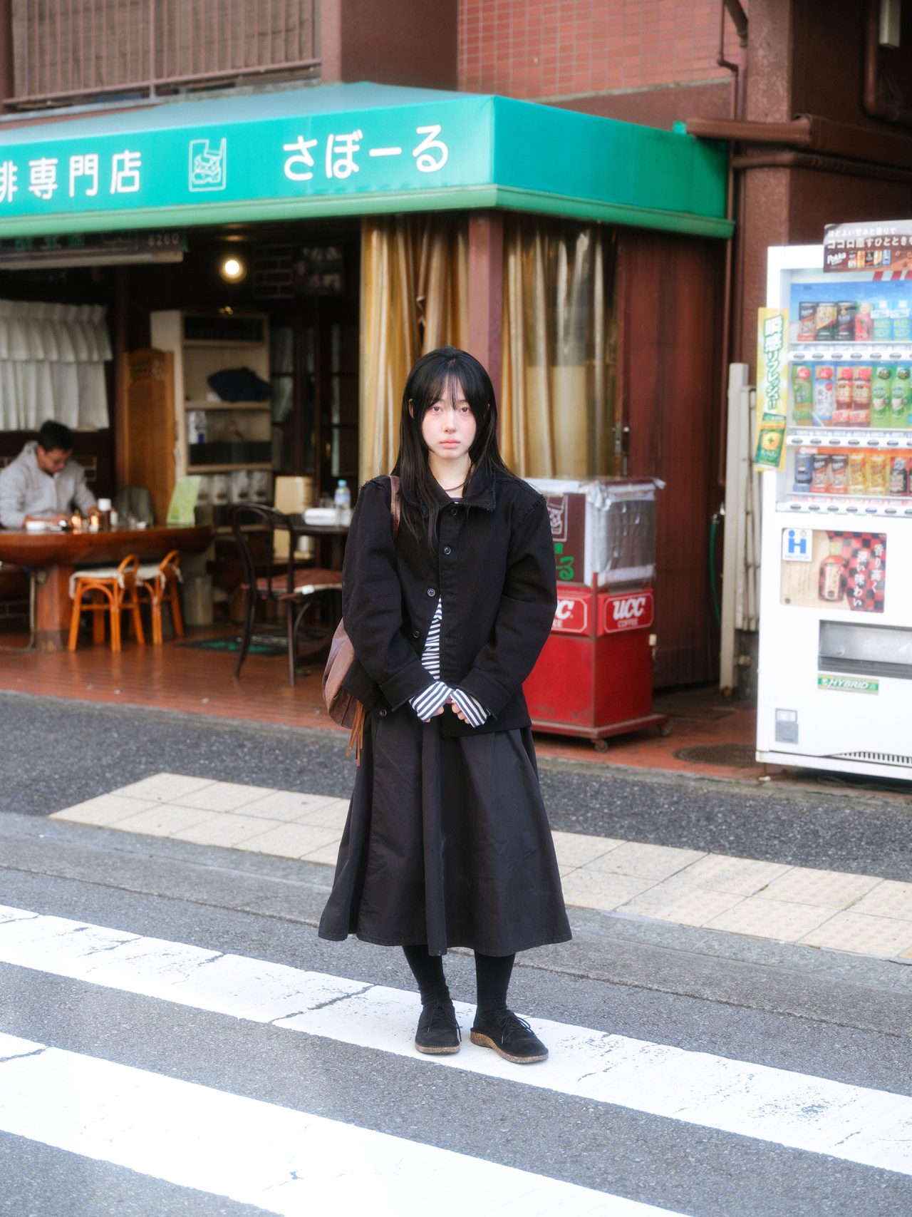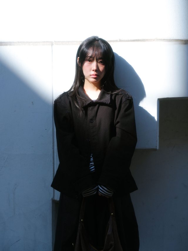 ジャケット/FLOW AUTHOR RATION (フロー オーサー レイション)、インナー/Brandy Melville (ブランディ メルビル)、スカート/無印良品、シューズ/BIRKENSTOCK (ビルケンシュトック)、バック/Dakota (ダコタ)