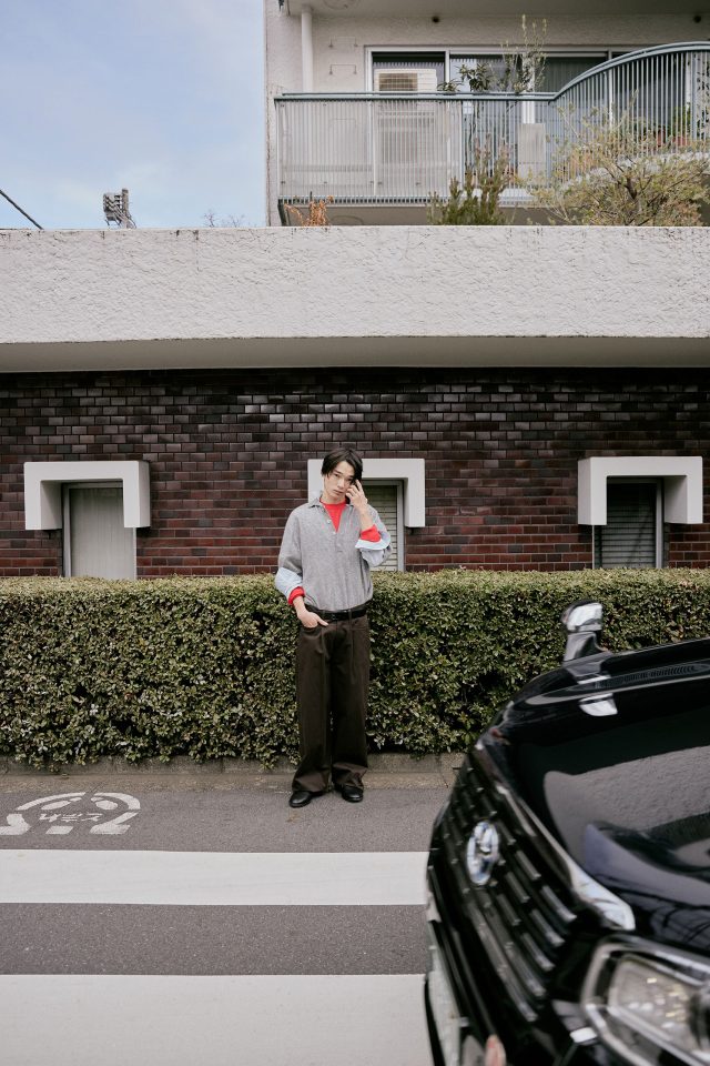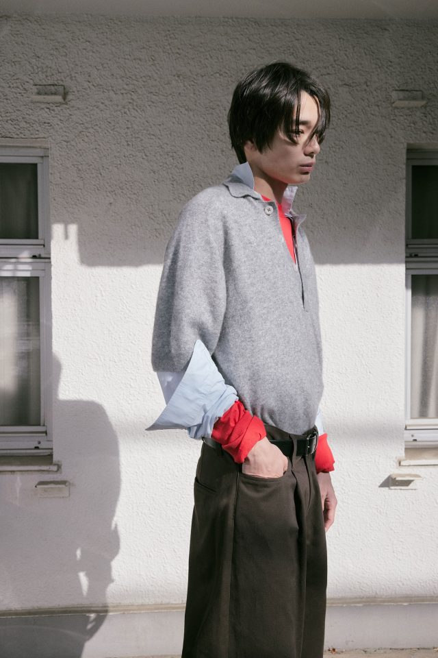 ニット ¥129,525/BIELO (ビエロ)、シャツ ¥37,400、パンツ ¥46,200/すべて ssstein (シュタイン)、中に着たニット ¥35,200/URU (ウル)、スリッポン ¥99,000/J.M. WESTON (ジェイエムウエストン)、ベルト (参考商品)/TOGA (トーガ)