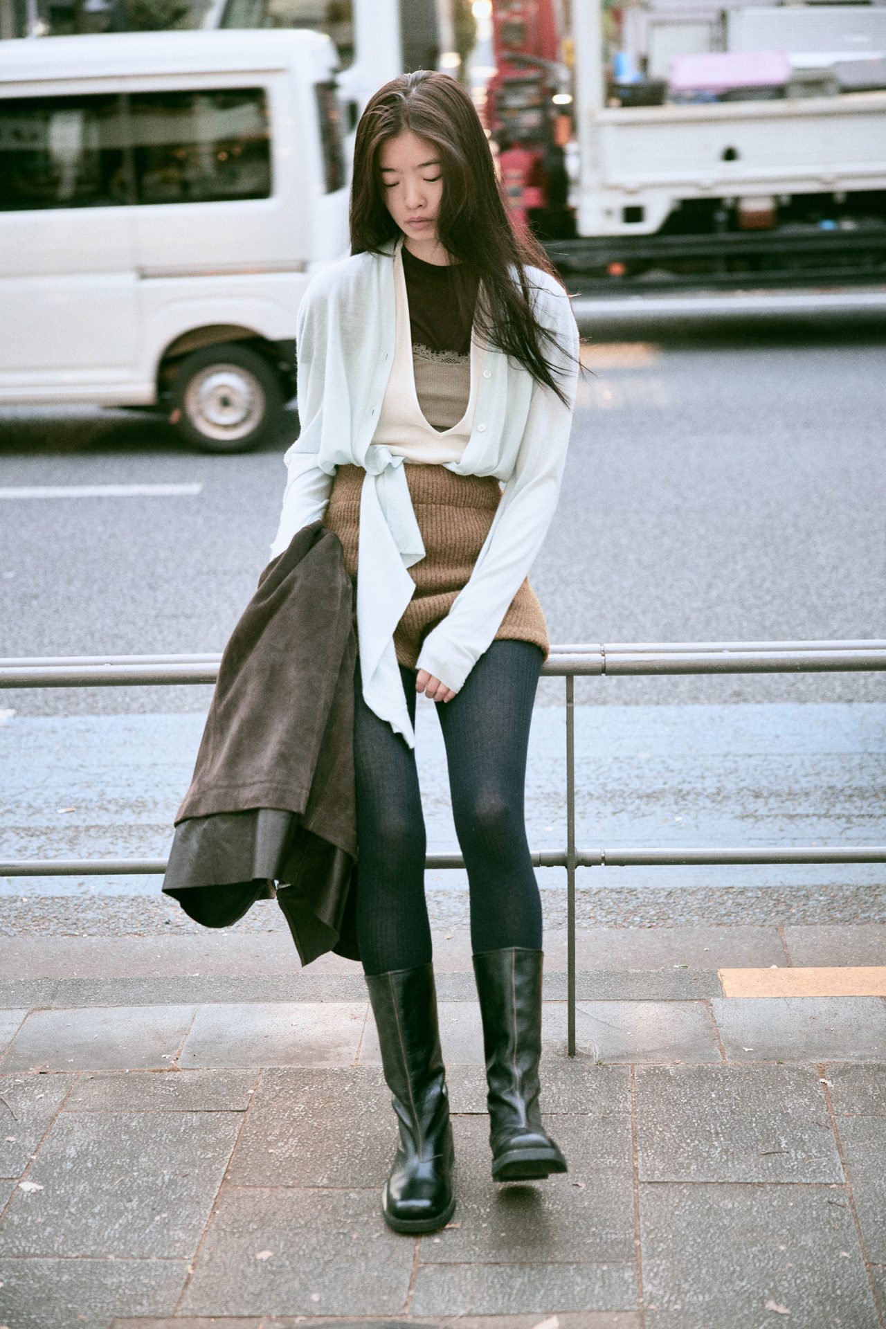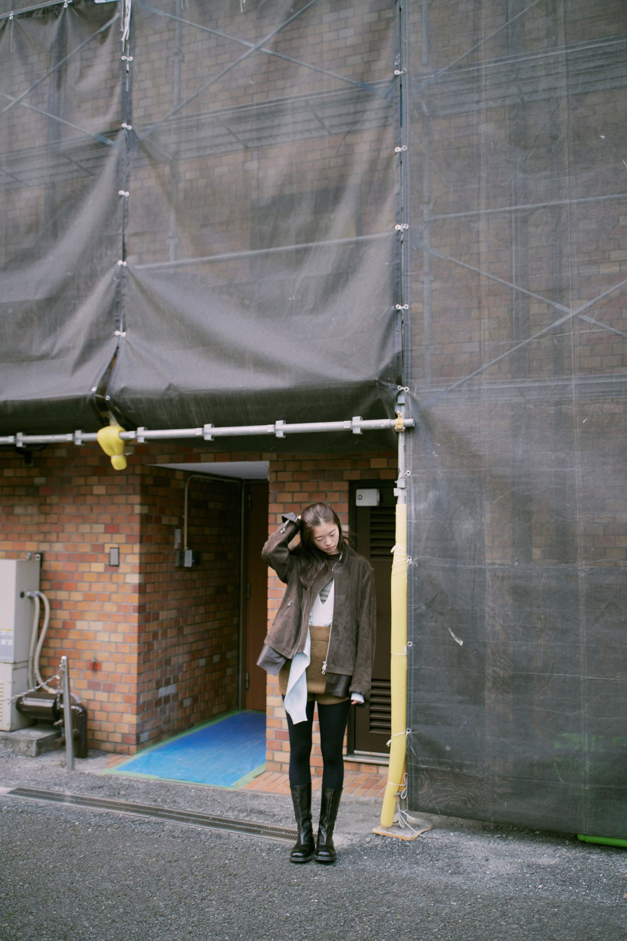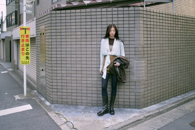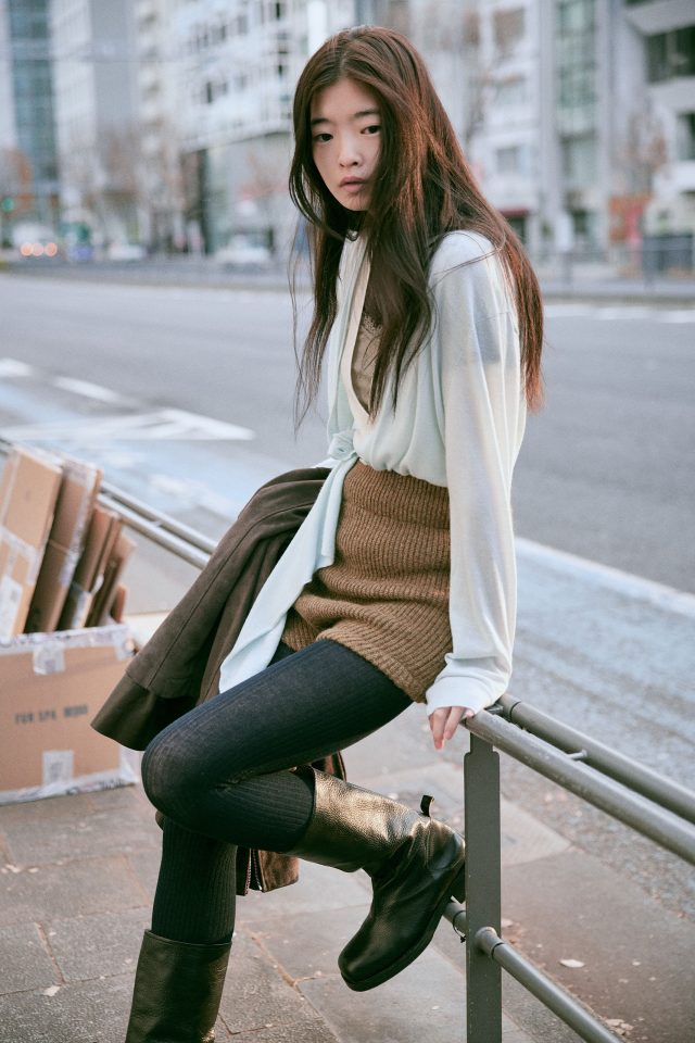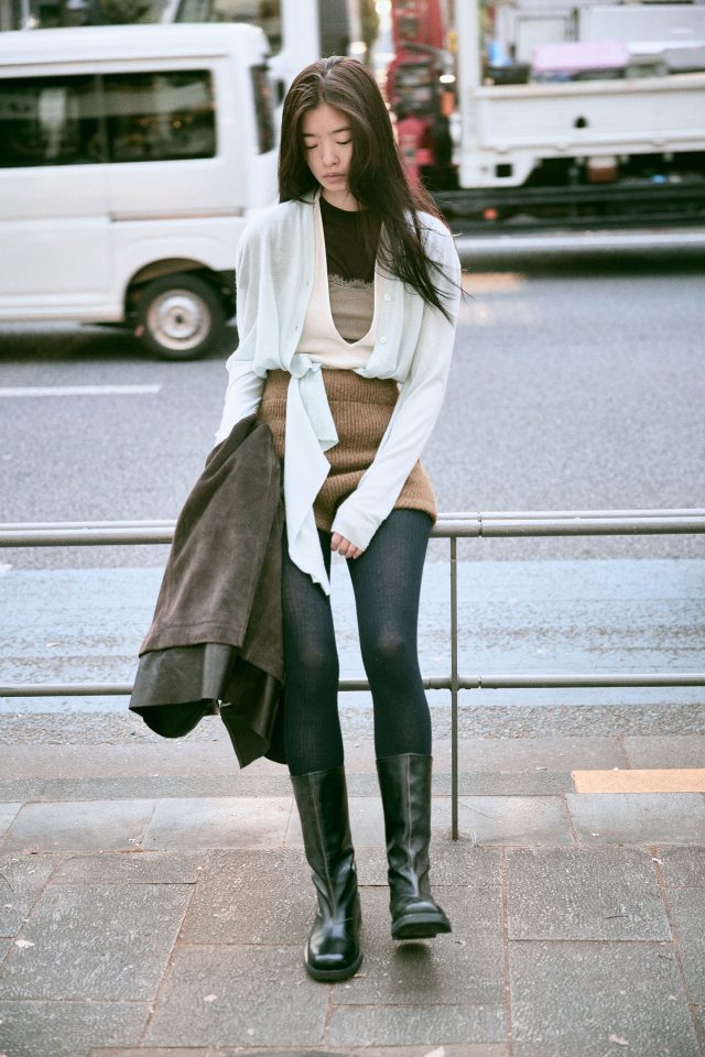 ジャケット ¥419,100、ブーツ ¥152,900/ともに OUR LEGACY (アワー レガシー)、ロングスリーブ ¥155,430 (参考価格)/BIELO (ビエロ)、中に着たボディスーツ ¥37,400、リブトップス ¥28,600、パンツ ¥41,800/すべて FUMIKA_UCHIDA (フミカ_ウチダ)、T シャツ ¥15,510/Baserange (ベースレンジ)、タイツ/スタイリスト私物