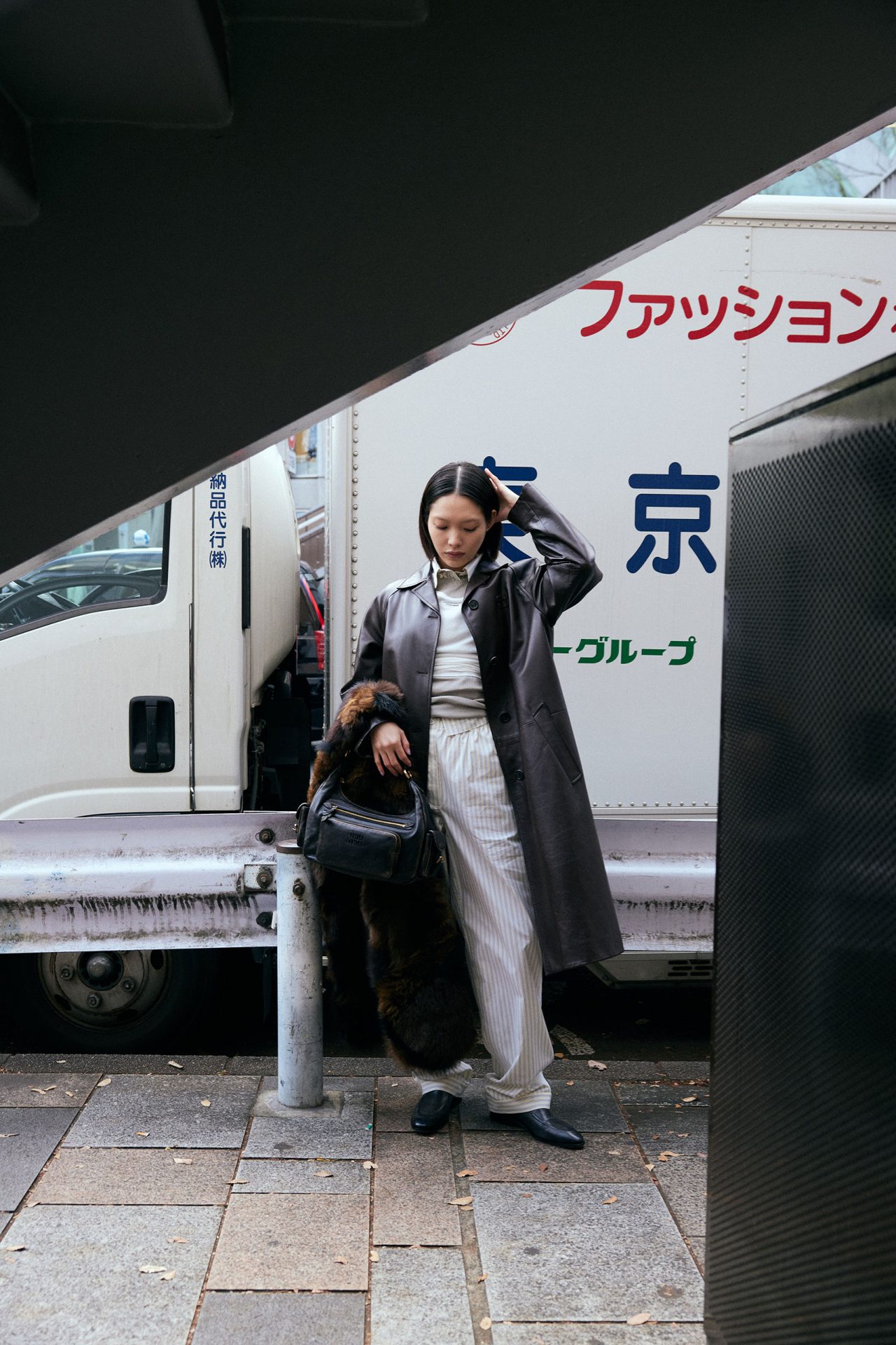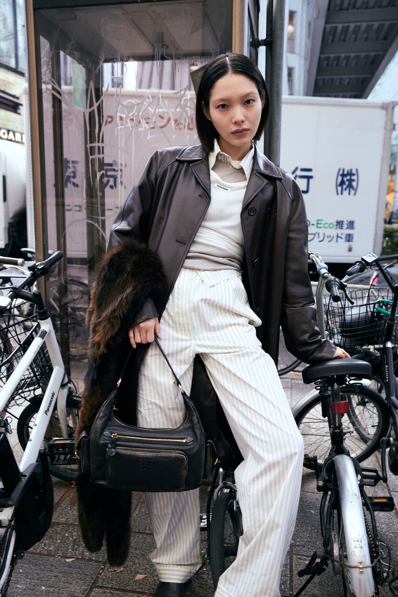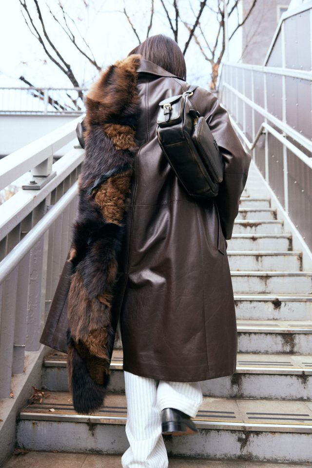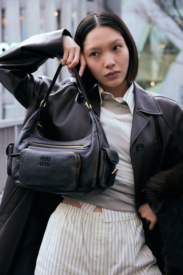 外側から、コート ¥1,265,000、トップス ¥170,500、リブスウェット ¥269,500、パジャマシャツ ¥176,000、パジャマパンツ ¥162,800、ローファー ¥181,500、ストール ¥1,100,000、バッグ ¥572,000 (すべて予定価格)/すべて MIU MIU