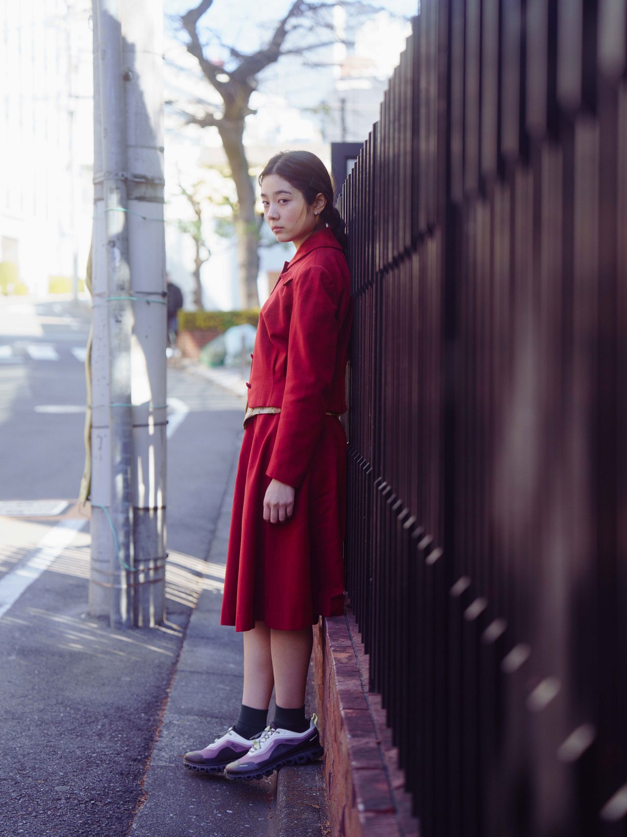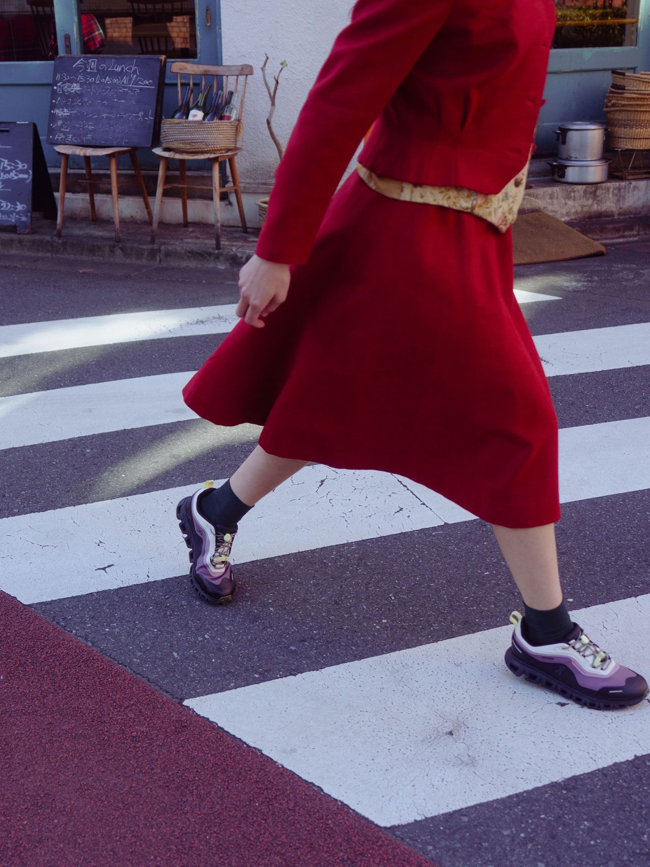 On (オン) の「Cloud 6 Geo」は、アウトドア由来の機能性と都会的なデザインを併せ持つ一足✨ Koko が合わせたのは、クラシカルな赤のジャケット&スカートのセットアップ。レイヤードした花柄のベストで奥行きを出しつつ、「Cloud 6 Geo」で足元にアクティブなムードをプラス。きれいめとストリートが自然に混ざり合う、今っぽいミックススタイルに。