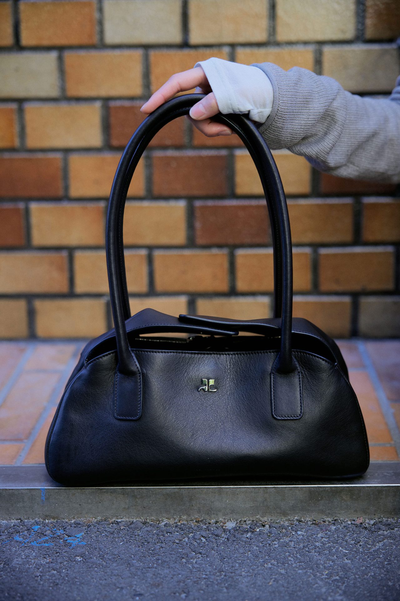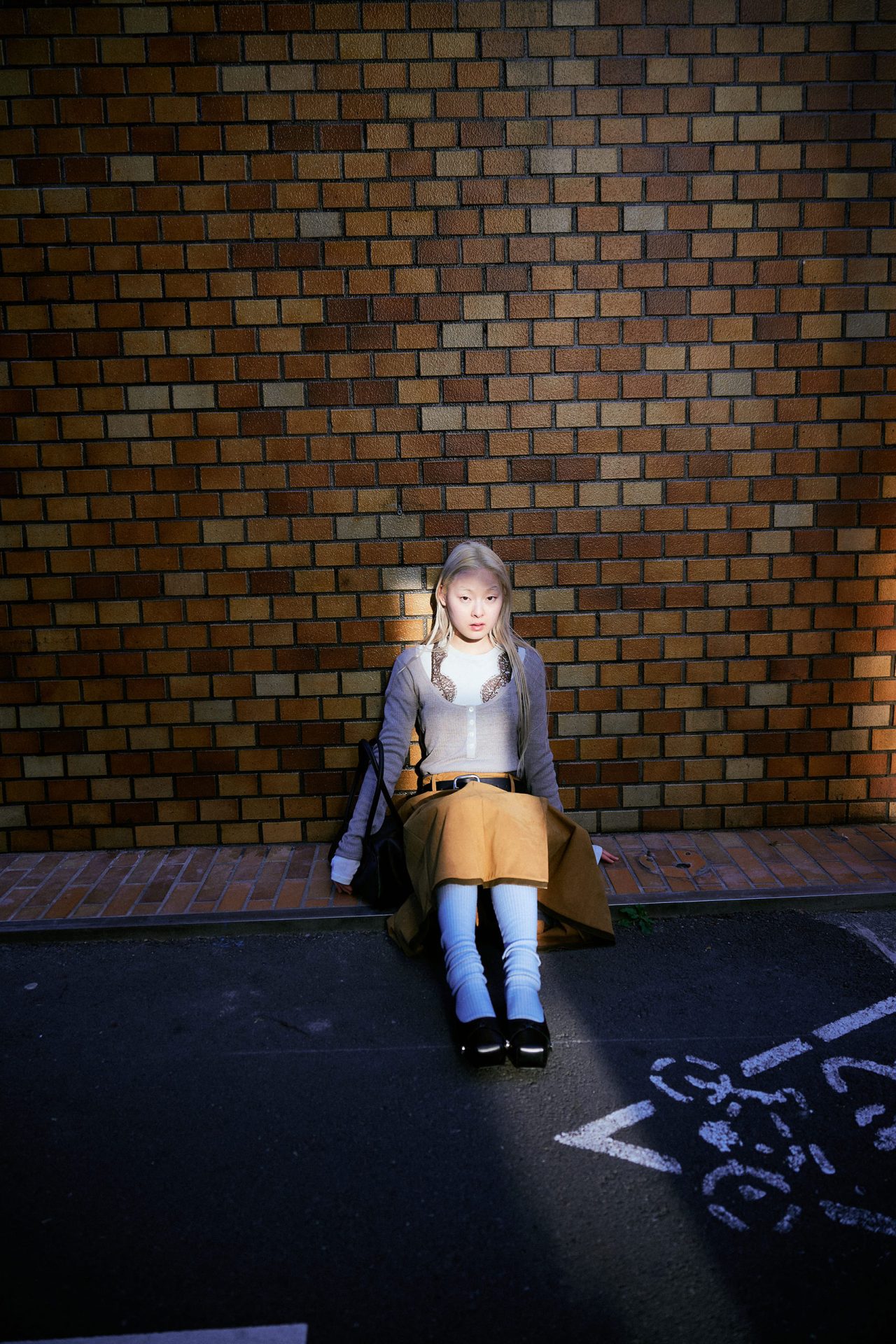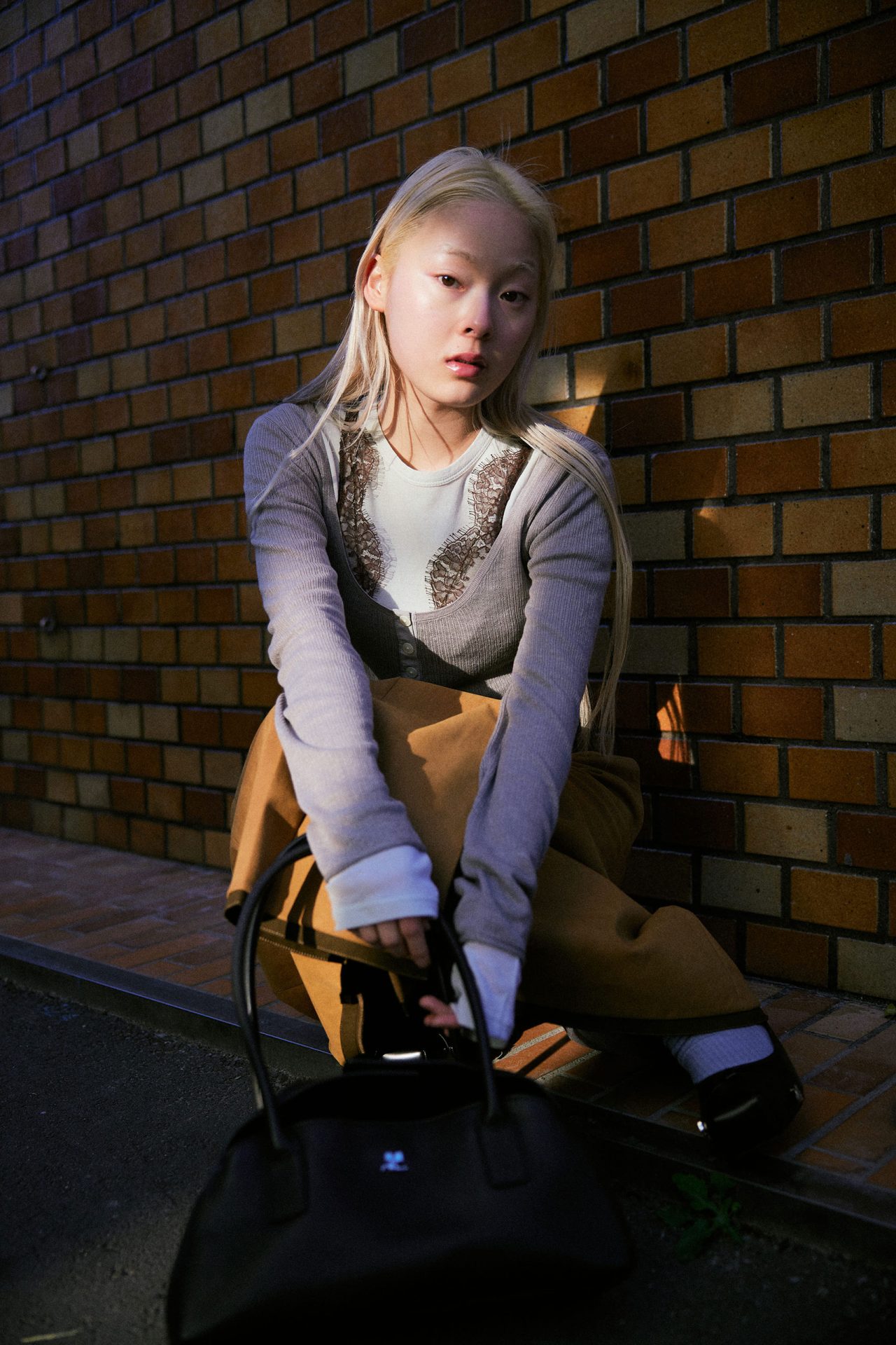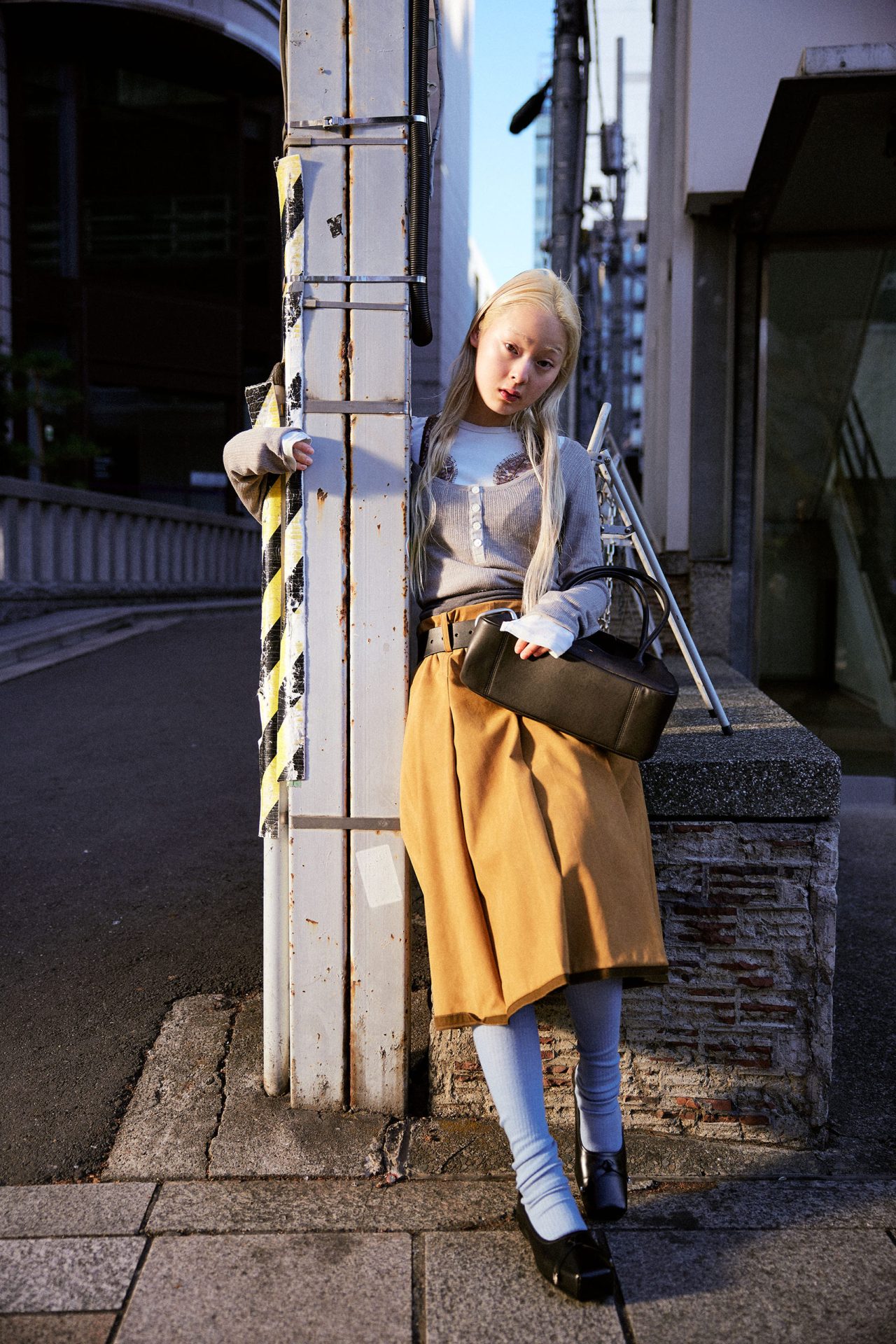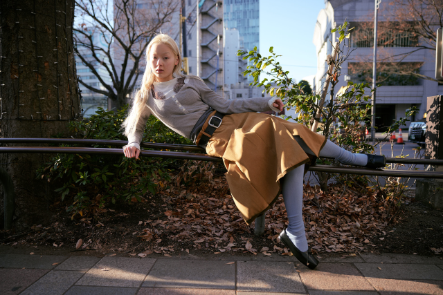 セーター ¥64,900、ロングスリーブ¥48,400/ともに HOPE (ホープ)、ブラレット ¥52,800、タイツ ¥30,800/ともに FUMIKA_UCHIDA (フミカ_ウチダ)、スカート ¥64,900、レザーベルト ¥24,200/ともに AKANE UTSUNOMIYA (アカネ ウツノミヤ)、シューズ ¥70,400 (ストラップ付き)/TOGA PULLA (トーガ プルラ)、ハンドバッグ ¥209,000/Courrèges (クレージュ)