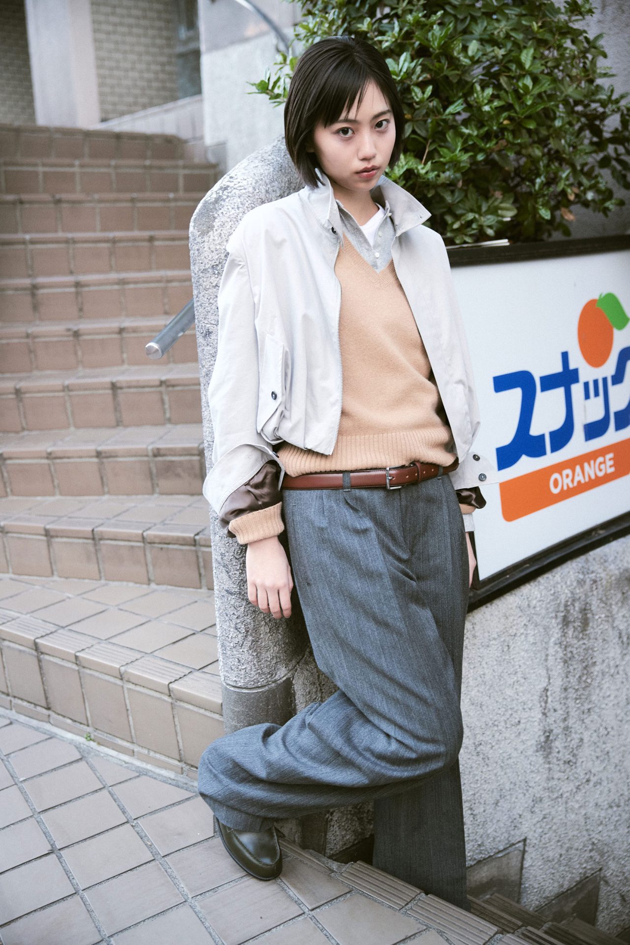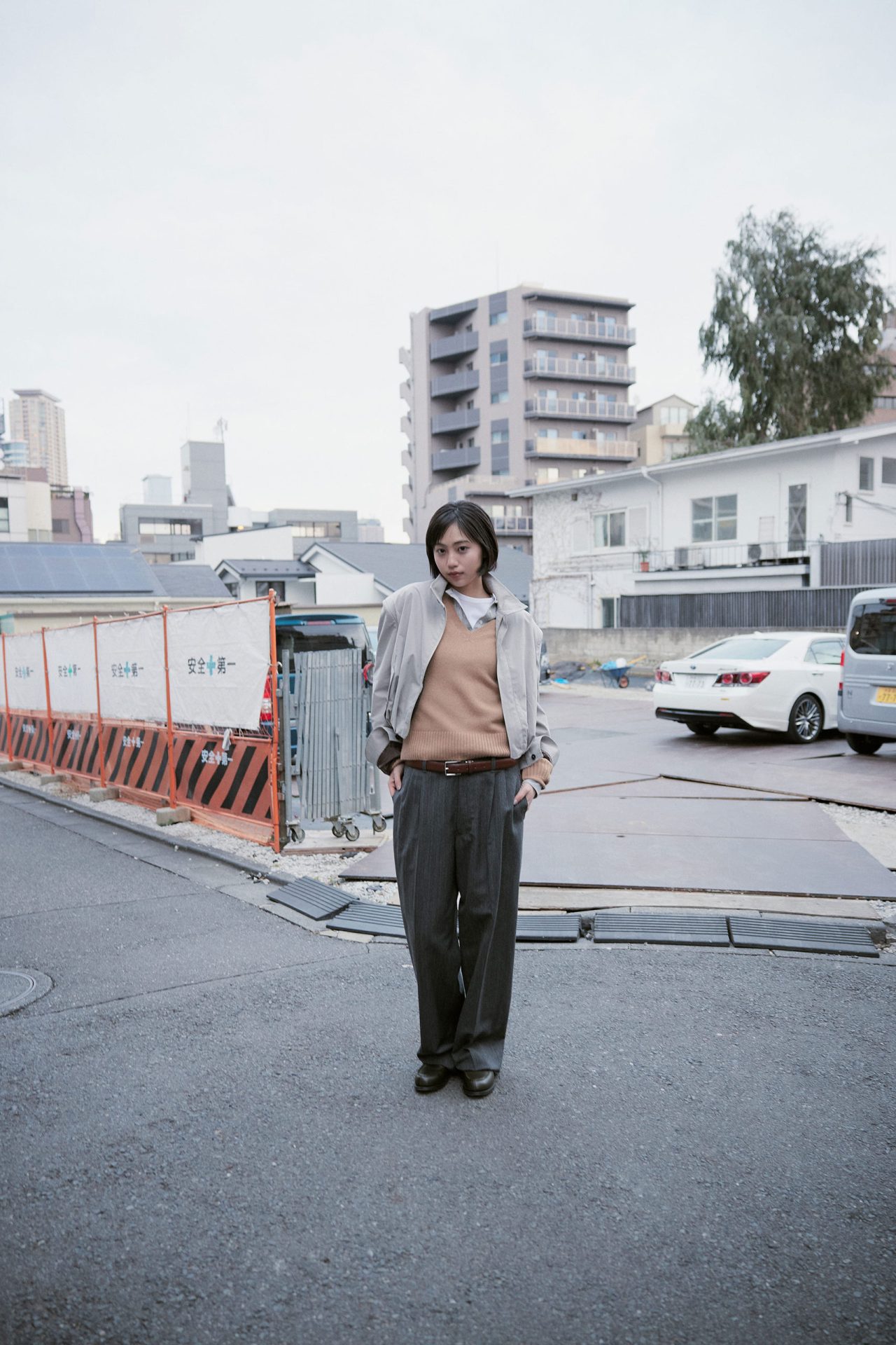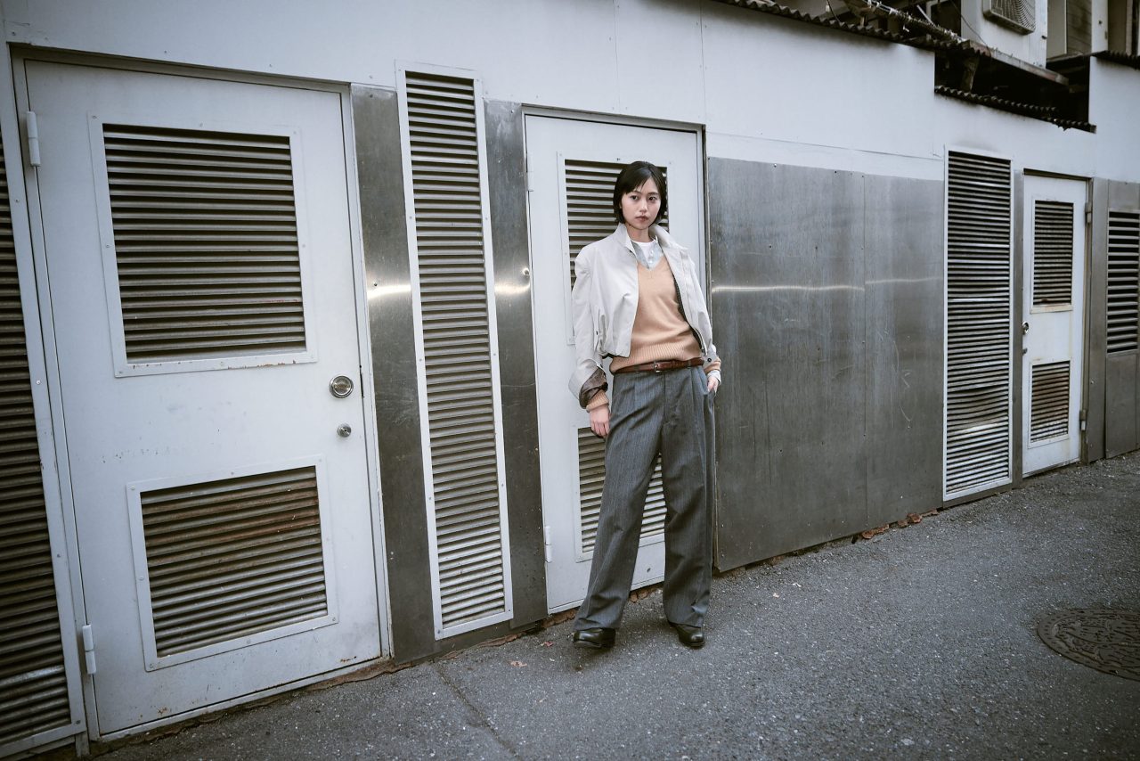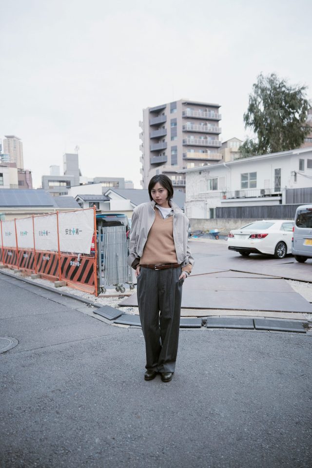 ジャケット ¥79,200、ベルト(参考商品)/ともに KEISUKEYOSHIDA (ケイスケヨシダ)、ニット ¥52,800/A.P.C (アー・ペー・セー)、ヘンリーネックトップス ¥20,900、Tシャツ ¥17,600/ともに SEA (シー)、パンツ ¥88,000 (ベルト付き)/FUMIKA_UCHIDA (フミカ_ウチダ)、ローファー ¥165,000/J.M. WESTON (ジェイエムウエストン)