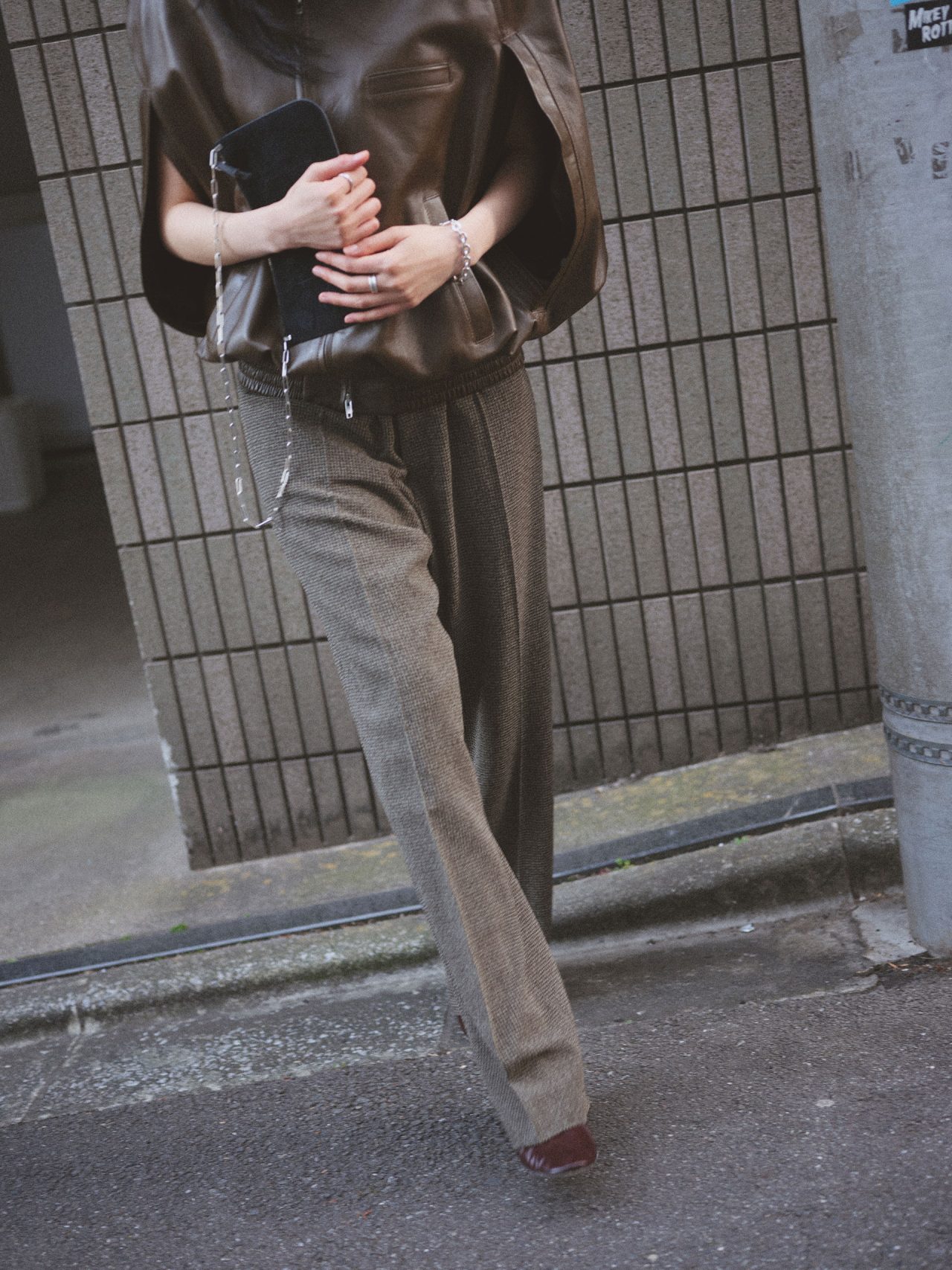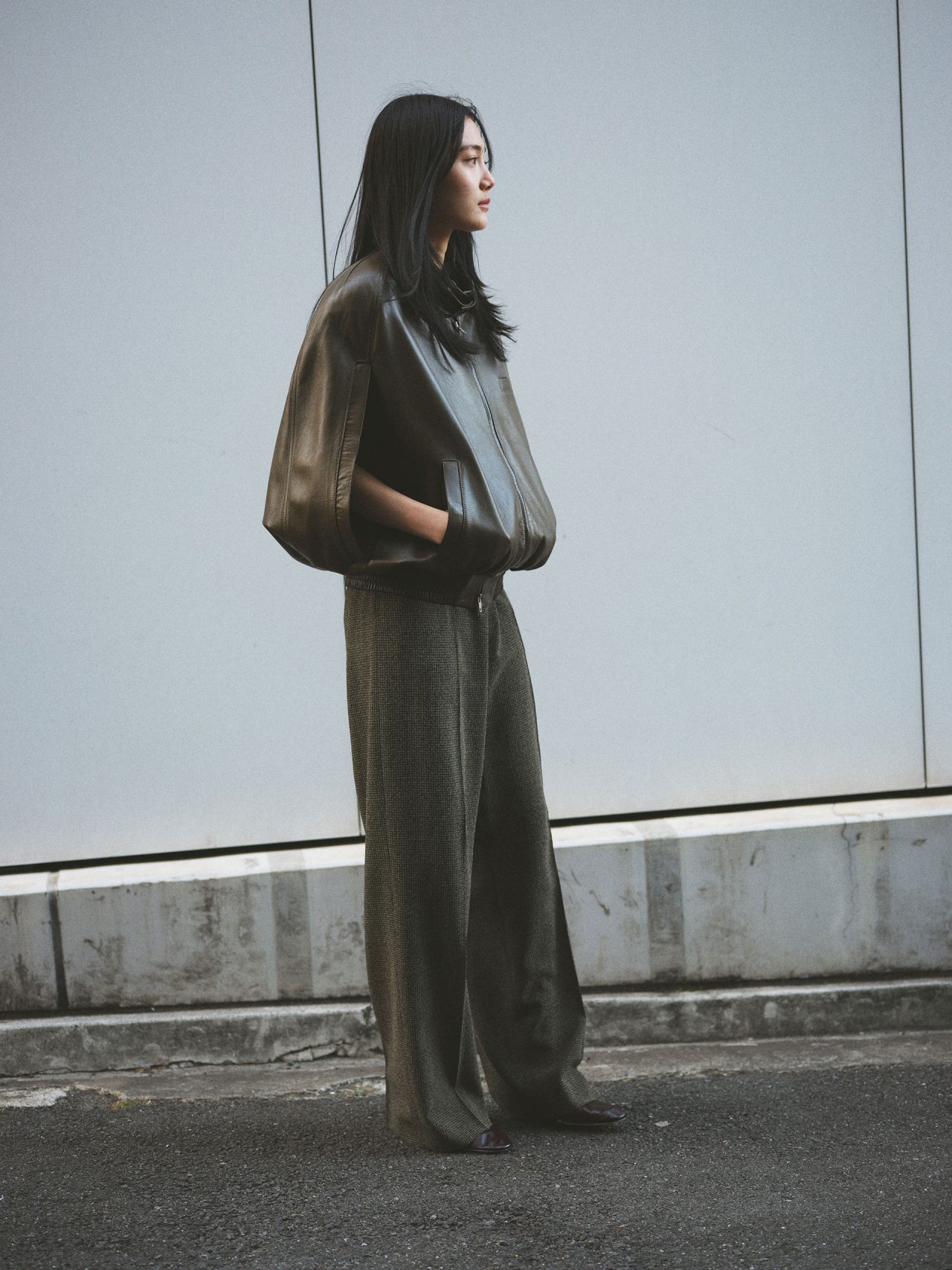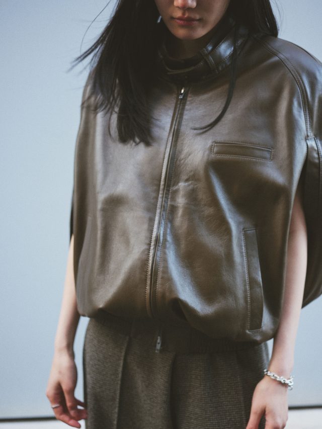 レザージャケット ¥799,000、パンツ ¥176,000、パンプス ¥151,000、バッグ ¥190,000/すべて Phoebe Philo (フィービー ファイロ)