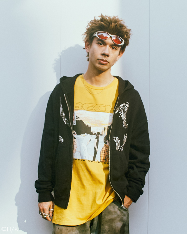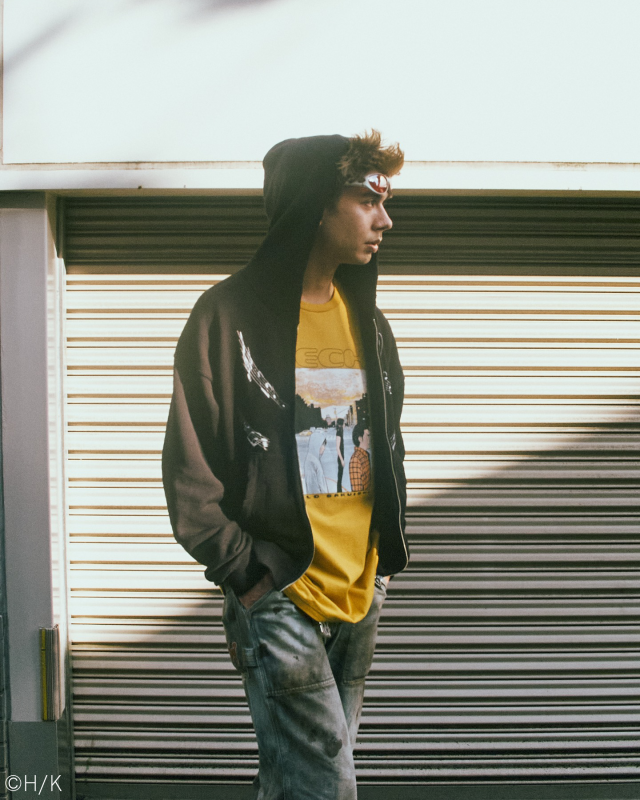 オカモトショウが選んだのは、イエローが目を惹くTシャツと、ラフに着れるジップフーディ。32巻の挿し絵を16版シルクで表現したTシャツは、夕焼けのグラデーションまで忠実に再現。シリアルナンバー入りで、99点限定のアイテムになっている。