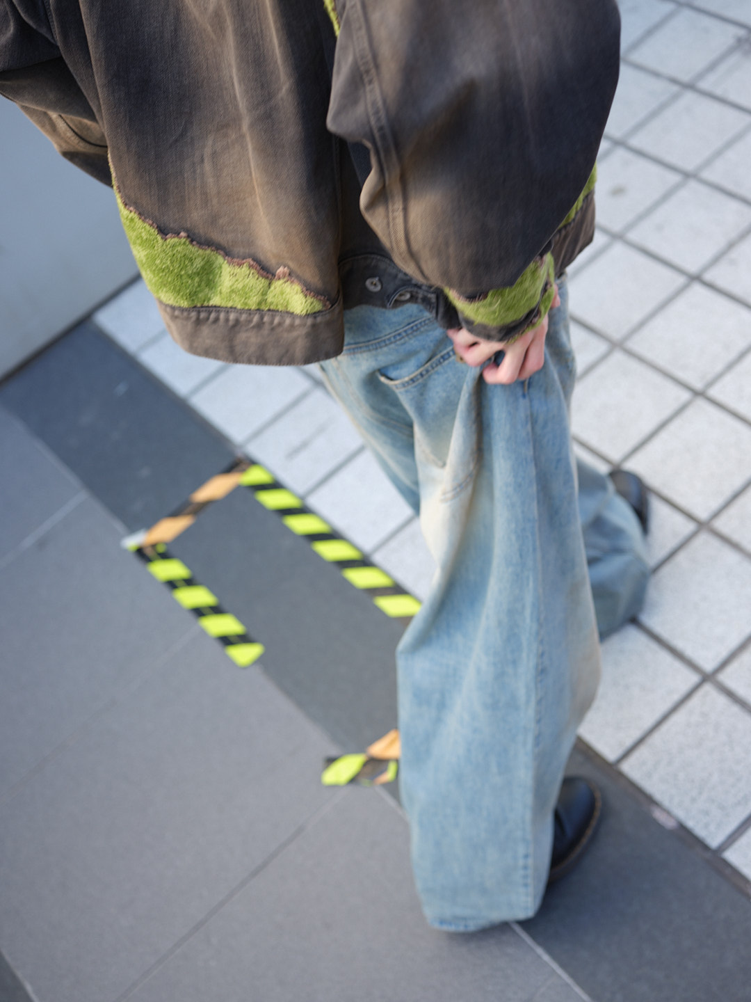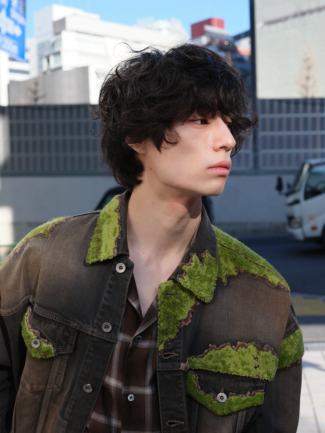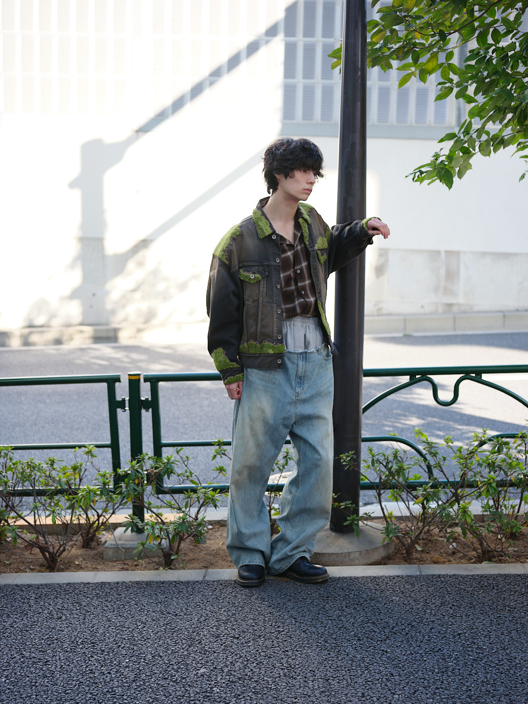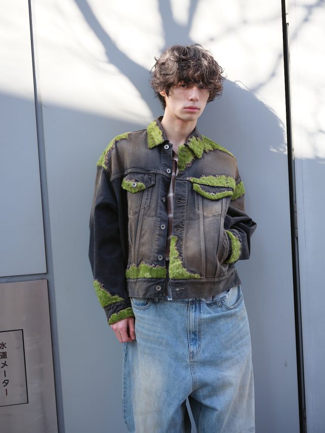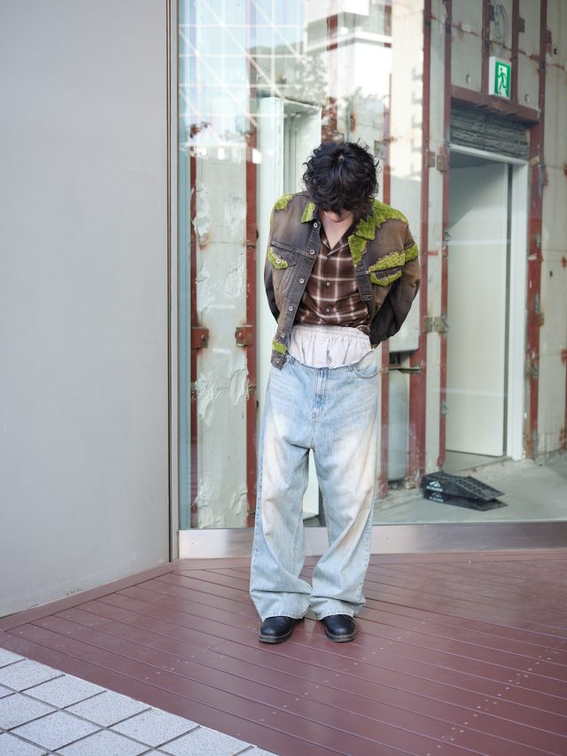 ジャケット ¥107,800/doublet (ダブレット)、シャツ ¥41,800/ssstein (シュタイン)、ジーンズ ¥90,200/WE11DONE (ウェルダン)、シューズ/モデル私物