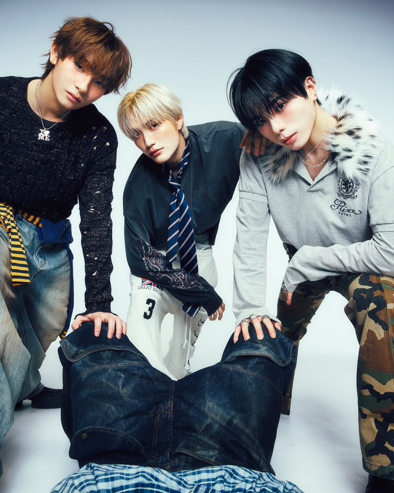 トップス¥44,000/KIDILL(キディル)、腰に巻いたトップス¥56,100、パンツ¥90,200/ともにWE11DONE(ウェルダン)、ネックレス¥17,690/THE OBJECT(ザ オブジェクト)、薬指につけたリング¥110,000、小指につけたリング¥77,000/ともにJUSTIN DAVIS(ジャスティン デイビス)