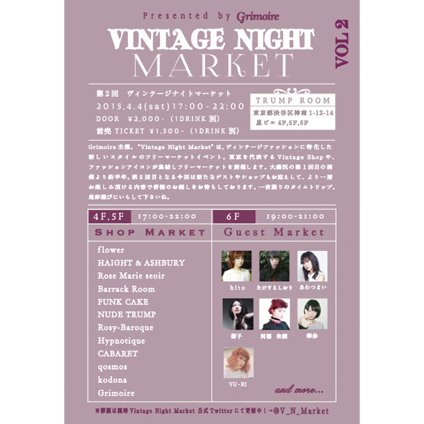 昨年大盛況に終わった東京・渋谷のヴィンテージセレクトショップ・Grimoire (グリモワール)が主催するフリーマーケット イベント「Vintage Night Market」。4月4日 (土) に 第二回目となるヴィンテージナイトマーケットが東京・渋谷のTRUMP ROOM (トランプ・ルーム)で開催される。