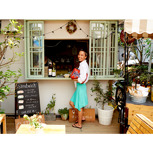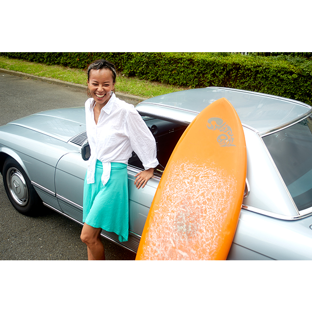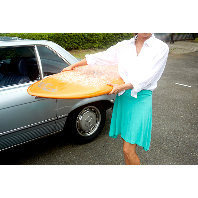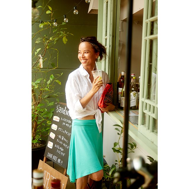 海が好きで、海外旅行ではビーチリゾートを訪れ、サーフィンを楽しむ渋木さんは、日本でも、夏は七里ヶ浜などで波に乗る。鮮やかなターコイズグリーンのスカートは、遊び心を感じるアシンメトリーのデザインと、ウエスト部分がゴムになっていて、ビーチでの着替えも楽なところがお気に入り。