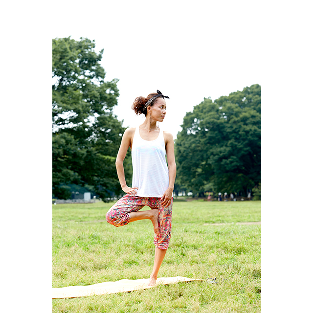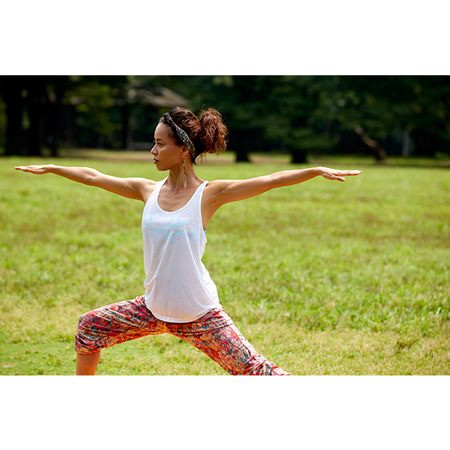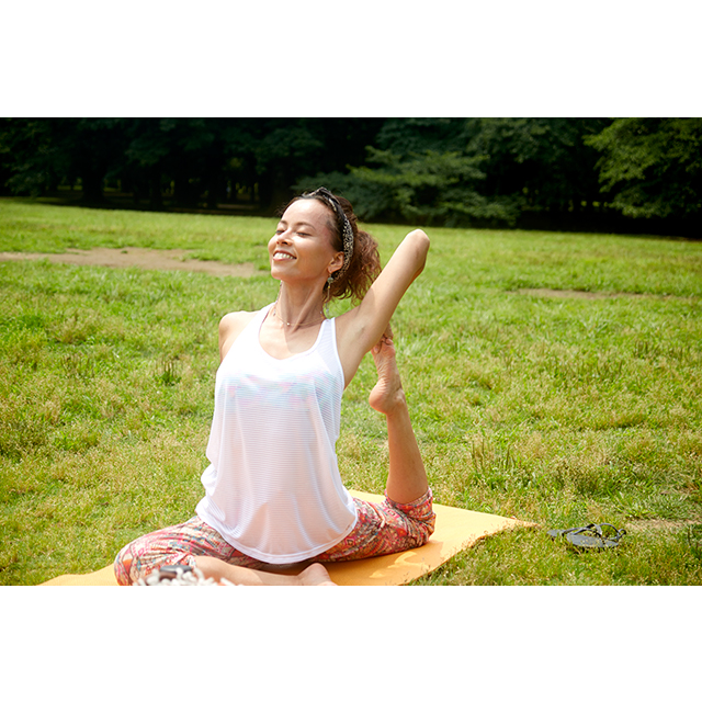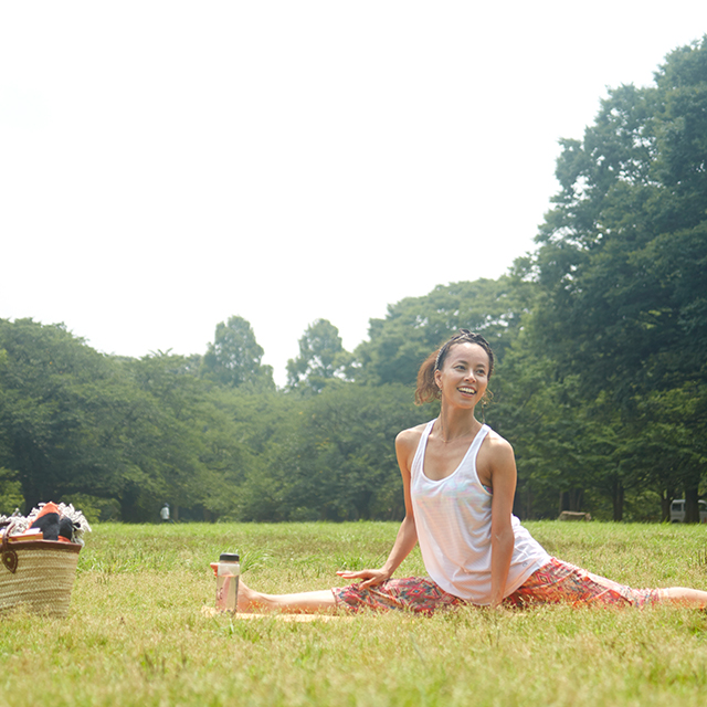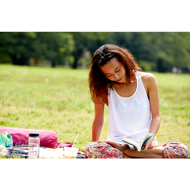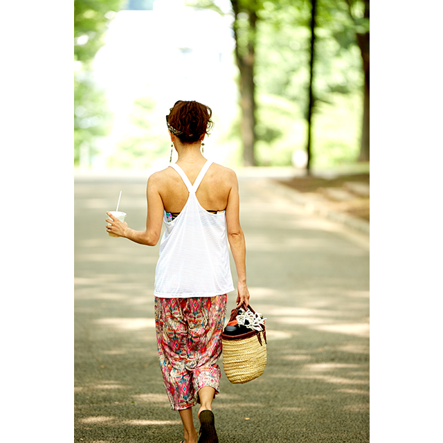外が気持ちいい季節は、パークヨガをしに、家から徒歩圏内の代々木公園へ。のんびり読書をしたり、食事をしたりとピクニックのようにゆたっりとした時間を過ごす。そんなときは、着替えずにそのまま過ごせる、おしゃれで動きやすいアイテムをチョイス。明るいプリント柄のヨガパンツに合わせたのは、GapFitのタンクトップ。肩を動かしやすいクロスバックと、タイトすぎずゆるすぎない絶妙なシルエットで、着心地も快適。