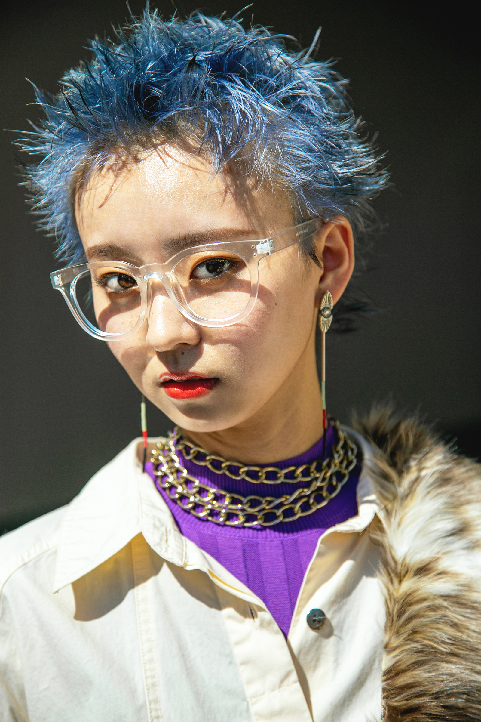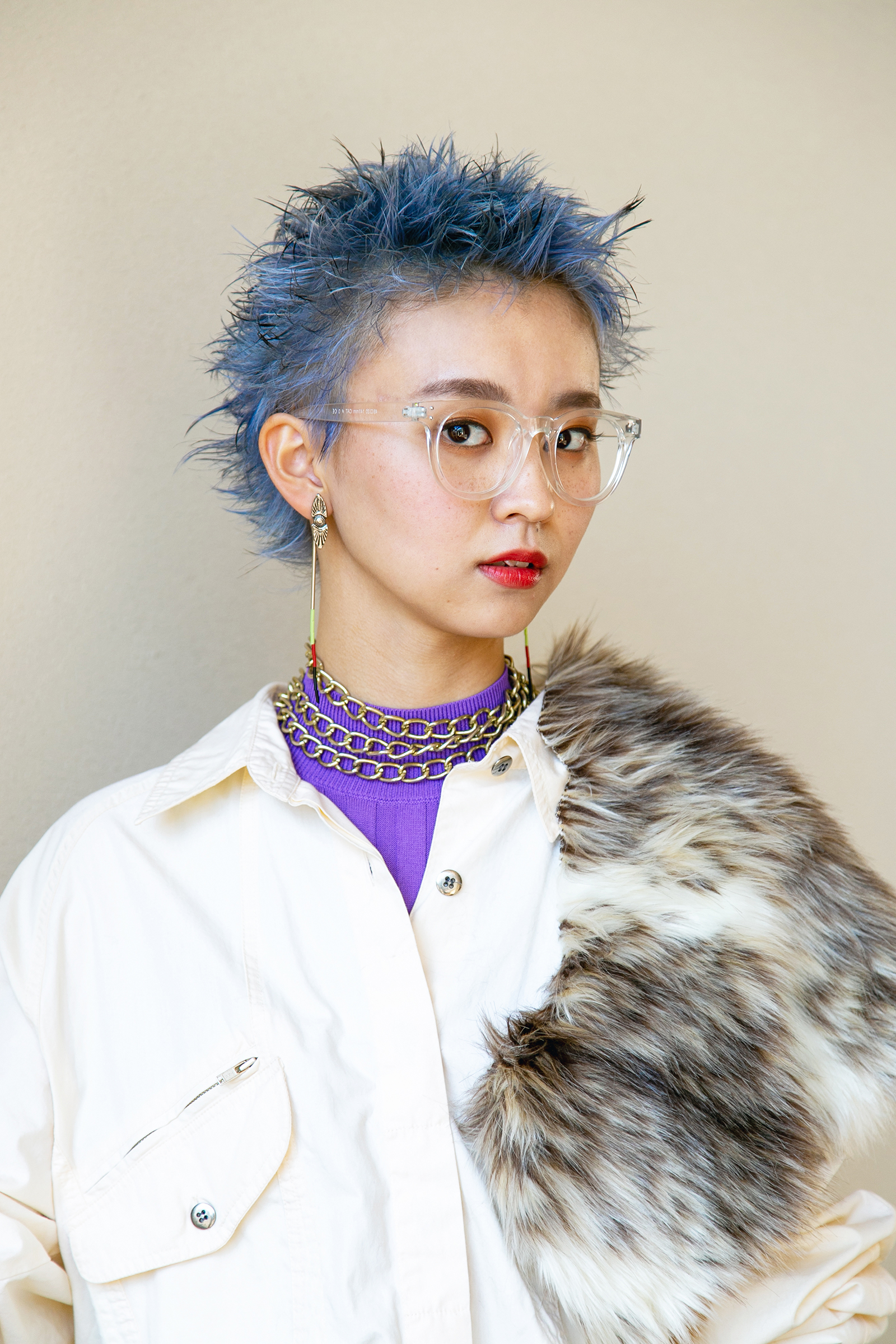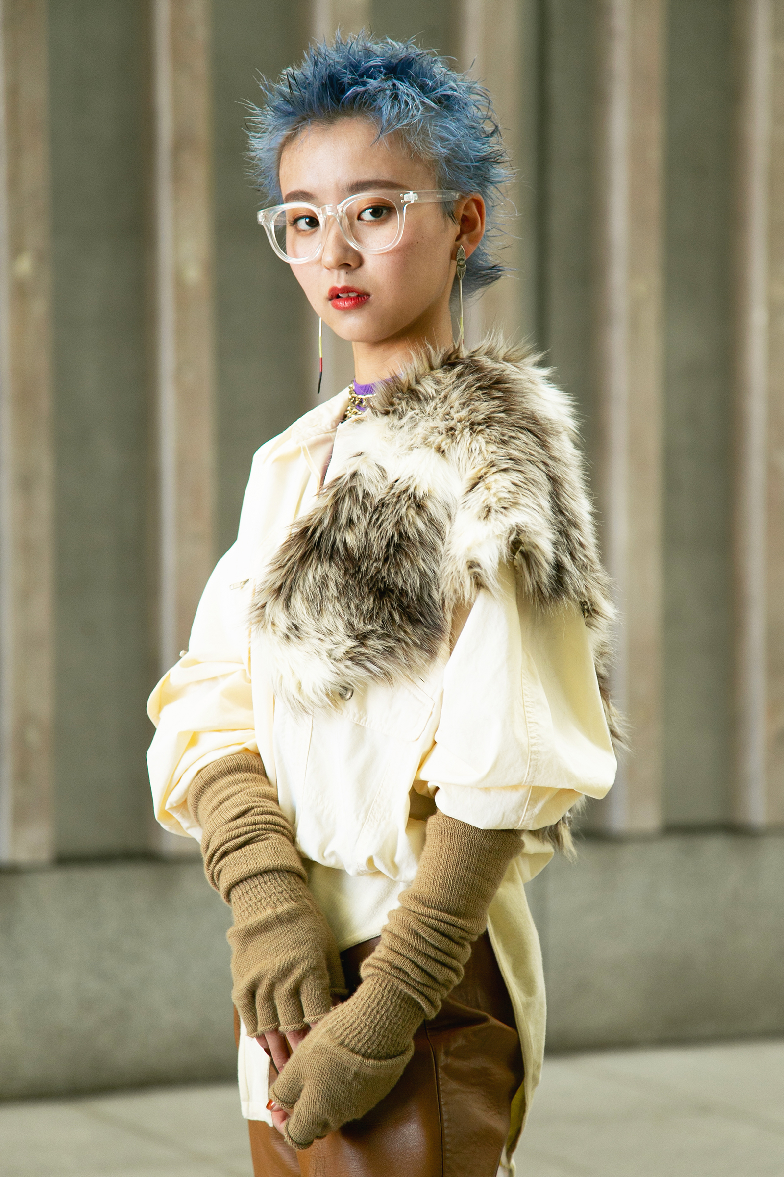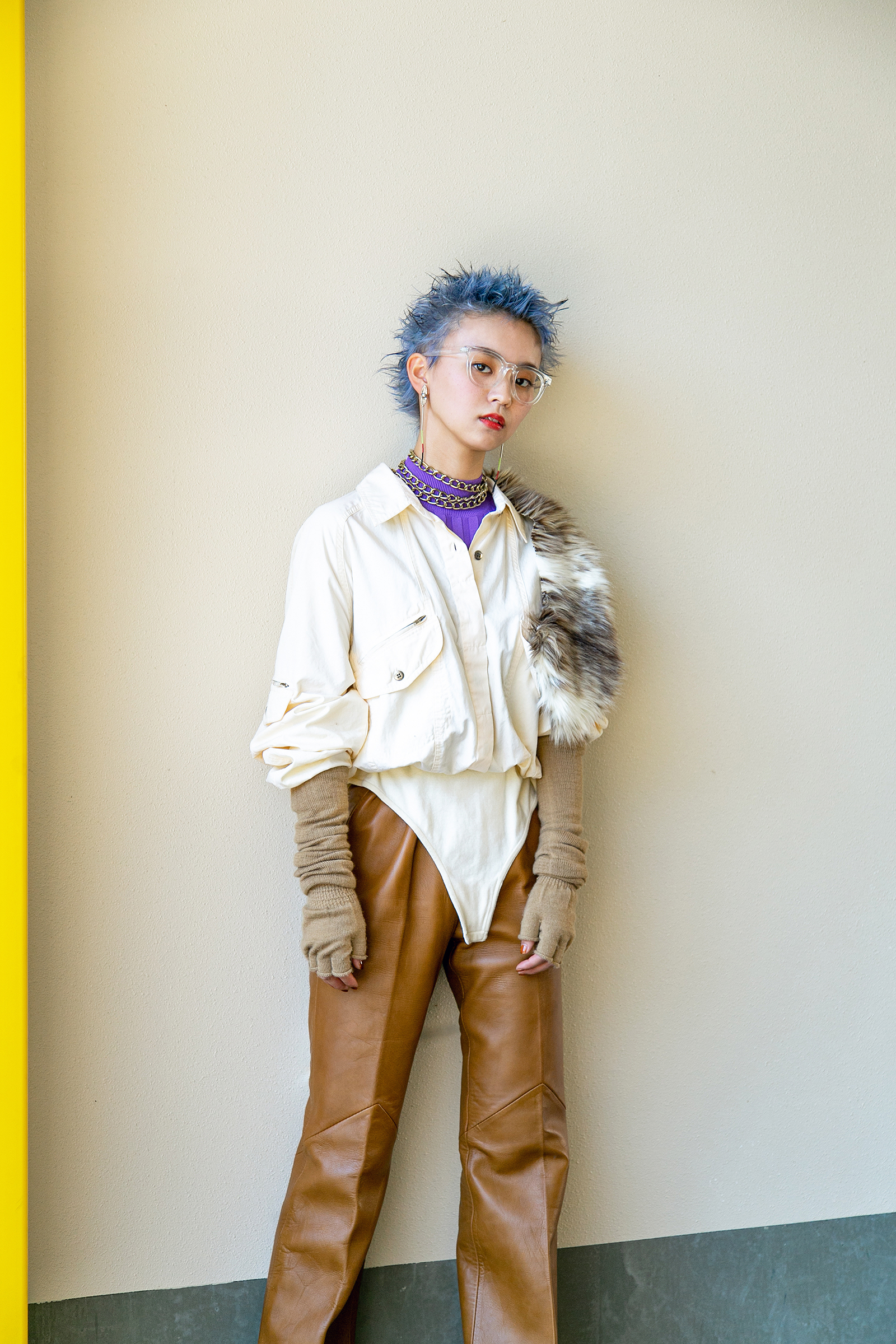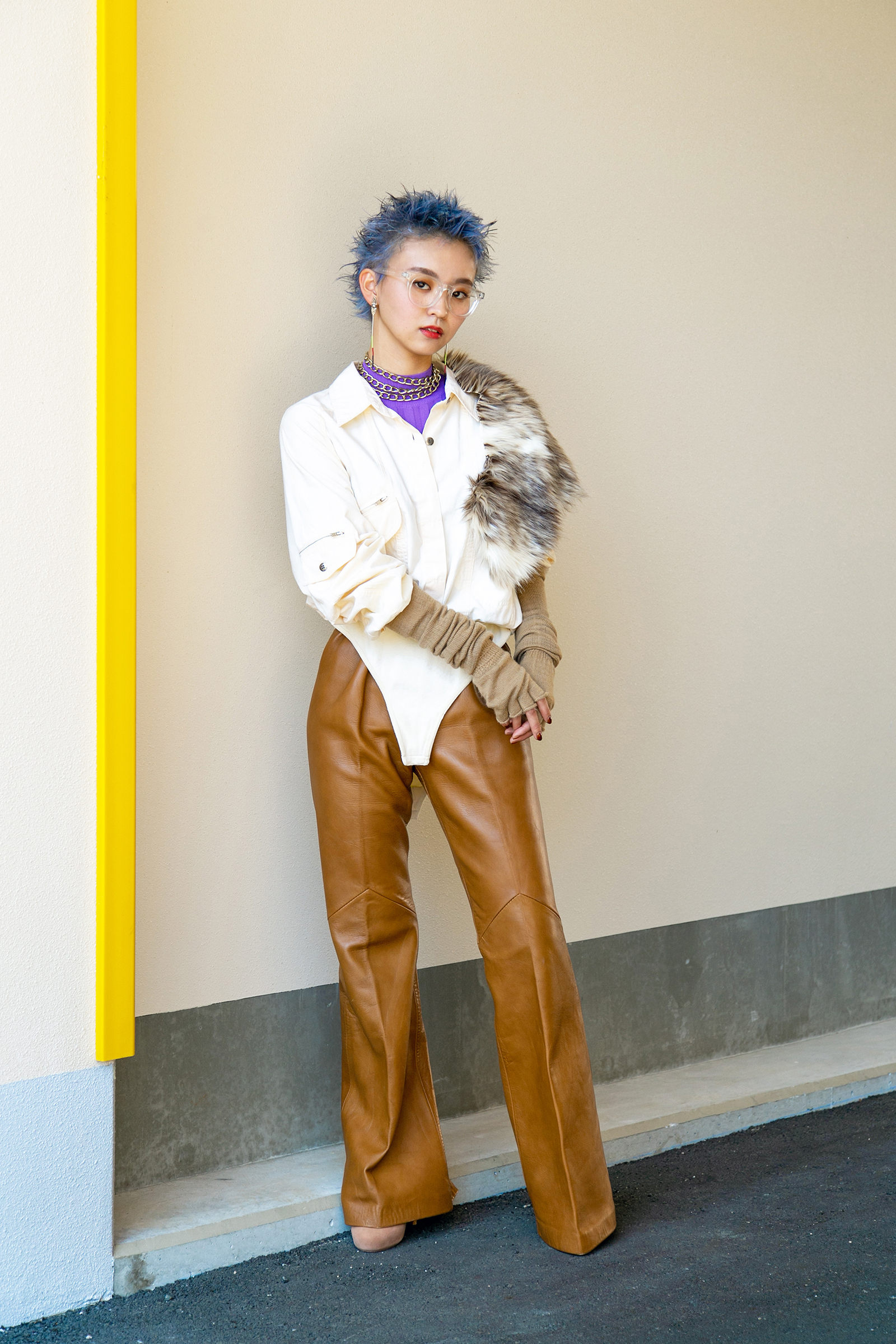 ヘアにインパクトを出し、ファッションはベージュのワントーンコーデにすることで、ハードさと上品さを両立。
