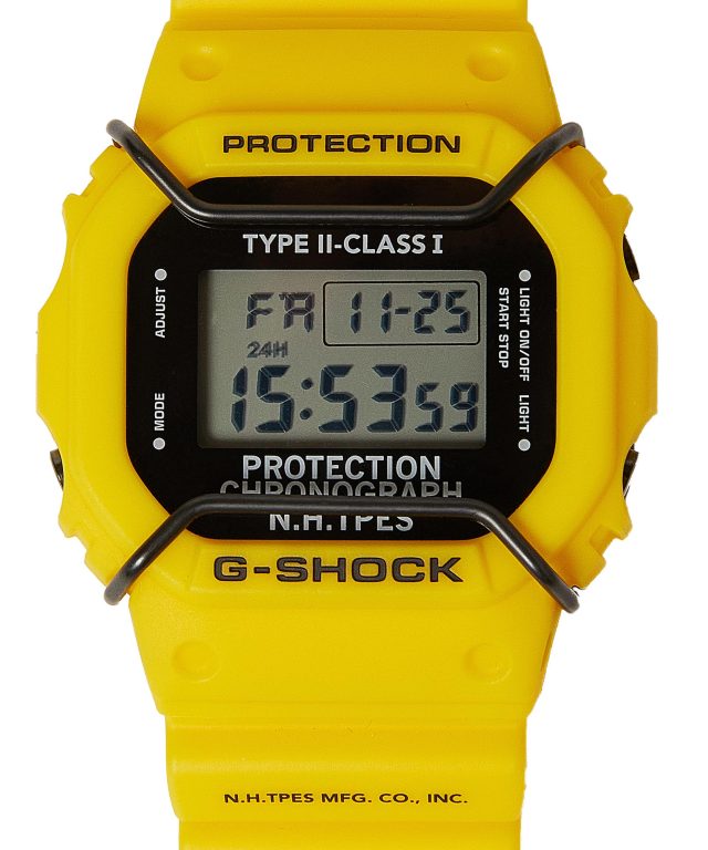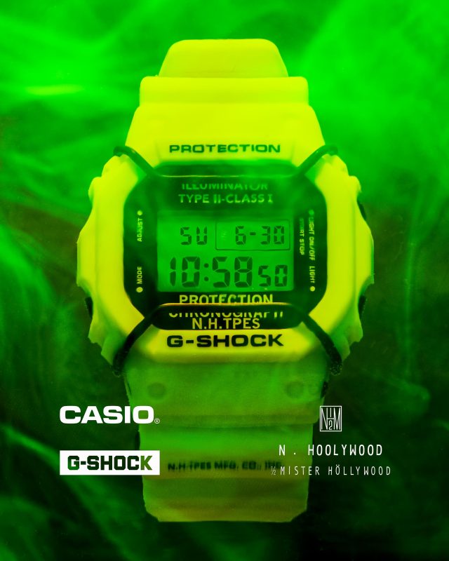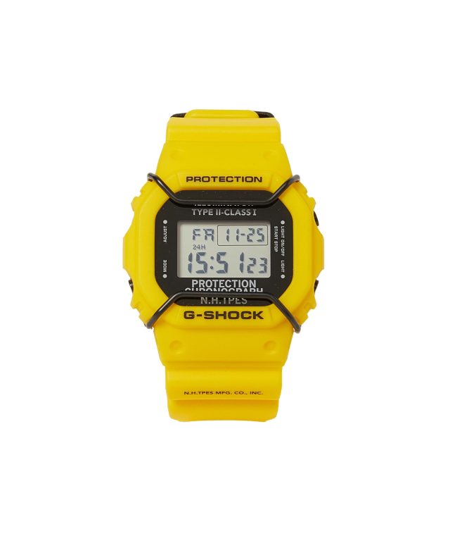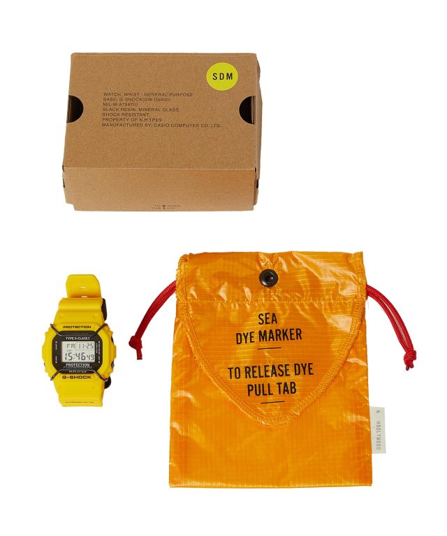 2014年のファーストコレクションを皮切りに、数々の名作を生み出してきた人気コラボレーションの第9弾となる今季は「DW-5600」がベース。1990年にデビューし、エクストリームスポーツを好む若者たちや、ストリートファッションシーンにおいて強く支持され、今では G-SHOCK を代表するプロダクトとなった本モデルをアップデート。初期に展開していたイエローカラーに彩られ、米軍が使用する、海面着色剤を意味する SEA DYE MARKER (シー ダイ マーカー) にインスピレーションを受けたミリタリーディテールが加えられた。