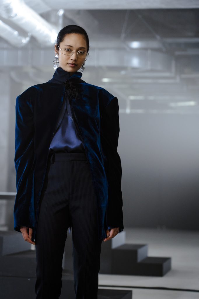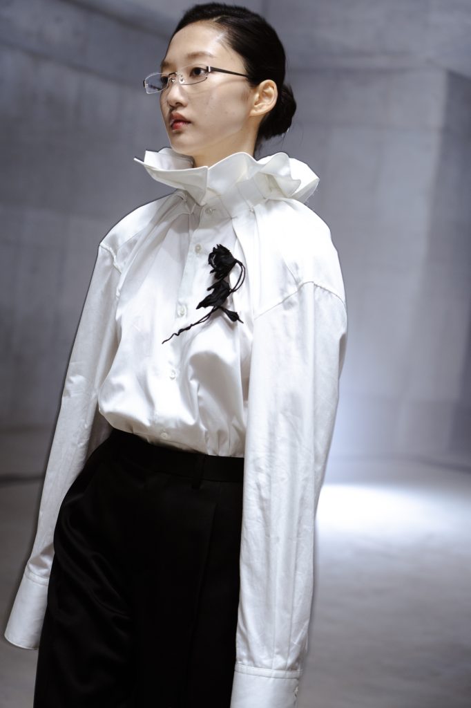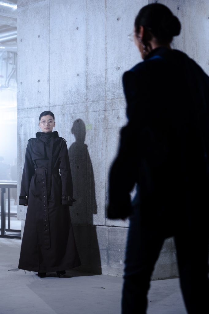これまでの KEISUKEYOSHIDA の前衛的なイメージとは異なった、高潔で禁欲的なムードが漂っていた。ブランドを象徴するトレンチコートやモーニングコートの襟は、首を覆い隠すほど誇張されたデザインにアップデート。ボトムスには余計なデザインを加えず、襟のデザインを一層厳格なものとして際立たせている。吉田にとって、未熟な自分と訣別するための最後の initiation、通過儀礼を意味する本コレクションは、ミューズとなった一人の少年から始まり、ラストルックには女優の水原希子も登場。Droptokyoでは、渋谷の地下空間で行われたステージの様子をお届けする。