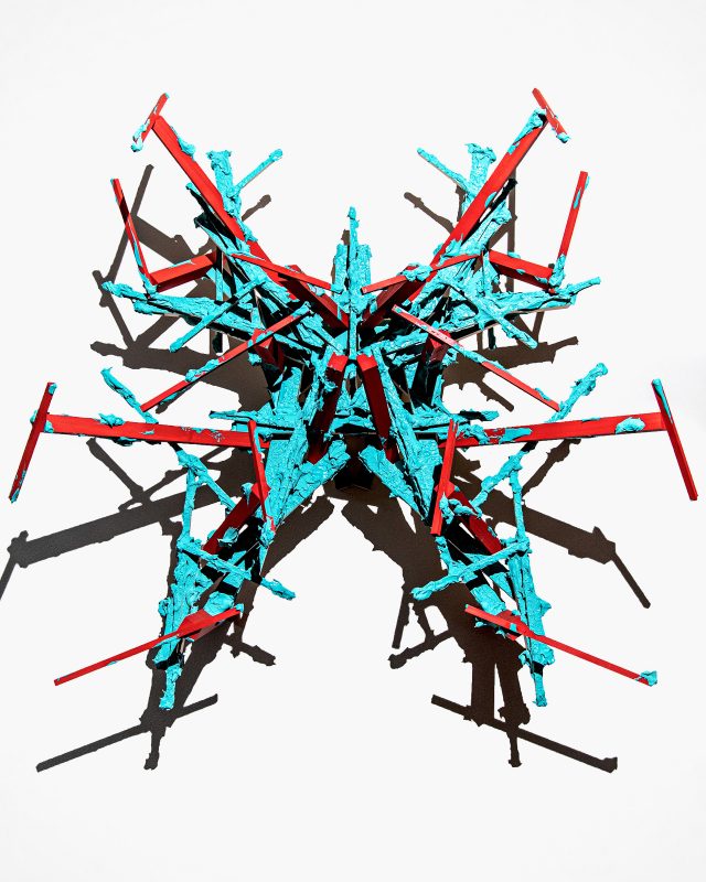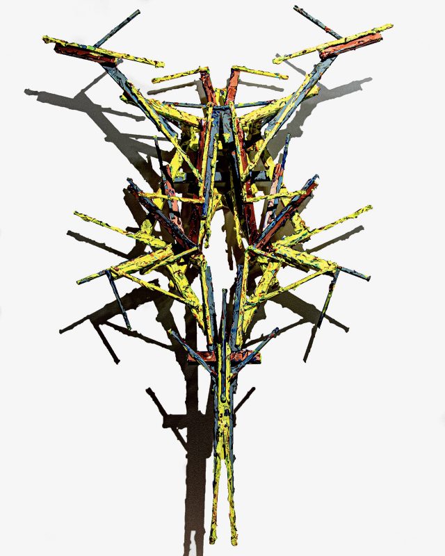本展では、2022年より制作を開始した木材彫刻「PIMT」が発表される。木材をつなぎ合わせ、さまざまな質感や色がのせられた左右対称の象徴的なフォルム。それらは、神道やアミニズムなど、