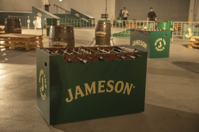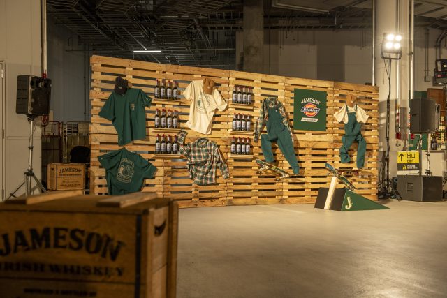 今回限定販売するコラボレーションボトルは、デニムをモチーフにしたデザイン。各ラベルはステッチで縁取られ、JAMESON ボトルがワークウェアを纏ったようなデザイン。フロントラベルには、JAMESON とDickies のロゴが力強く示され、LIMITED EDITION のゴールド文字が目立つ。ネックラベルには、JAMESON のアイコンとして親しまれているバレルマン(樽職人)が Dickies のロゴを担いだグラフィックとなってあしらわれているのもポイントとなっている。